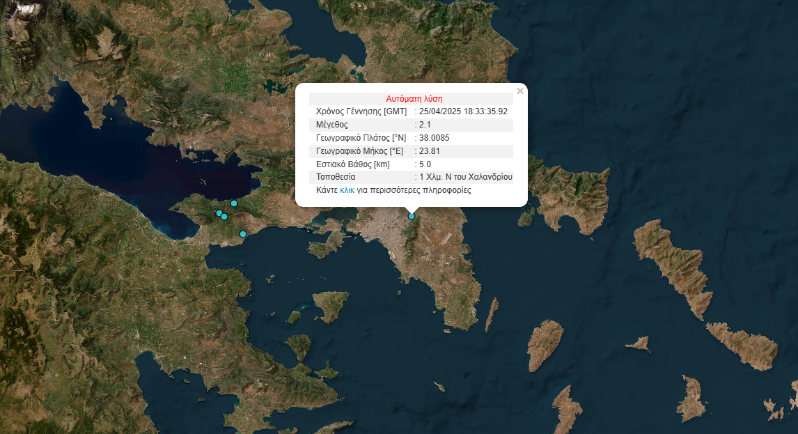 Σύμφωνα με την αυτόματη λύση του Γεωδυναμικού Ινστιτούτου, το επίκεντρο εντοπίζεται ένα χιλιόμετρα νότια του Χαλανδρίου, και το εστιακό βάθος στα 5 χιλιόμετρα.