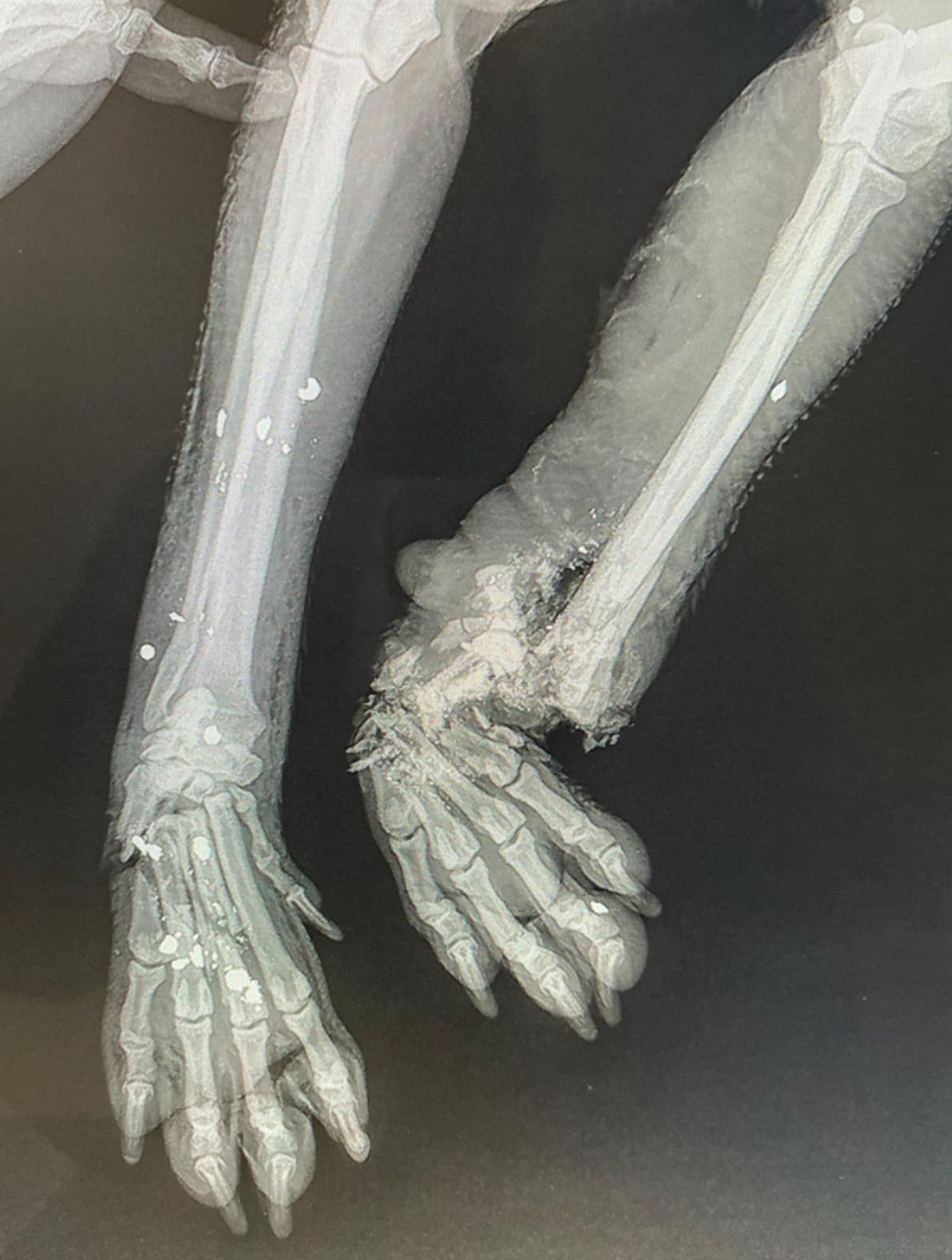 Η μικρόσωμη σκυλίτσα, η οποία από θαύμα είναι ακόμη ζωντανή, βρέθηκε σοβαρά χτυπημένη, με τα κόκκαλα στο ένα της πόδι να είναι κυριολεκτικά θρυμματισμένα, ενώ στο άλλο πόδι το κόκκαλο φαίνεται εκτεθειμένο. Παράλληλα, στο σώμα της βρέθηκαν και σκάγια, τα οποία επιβεβαιώνουν πυροβολισμό!