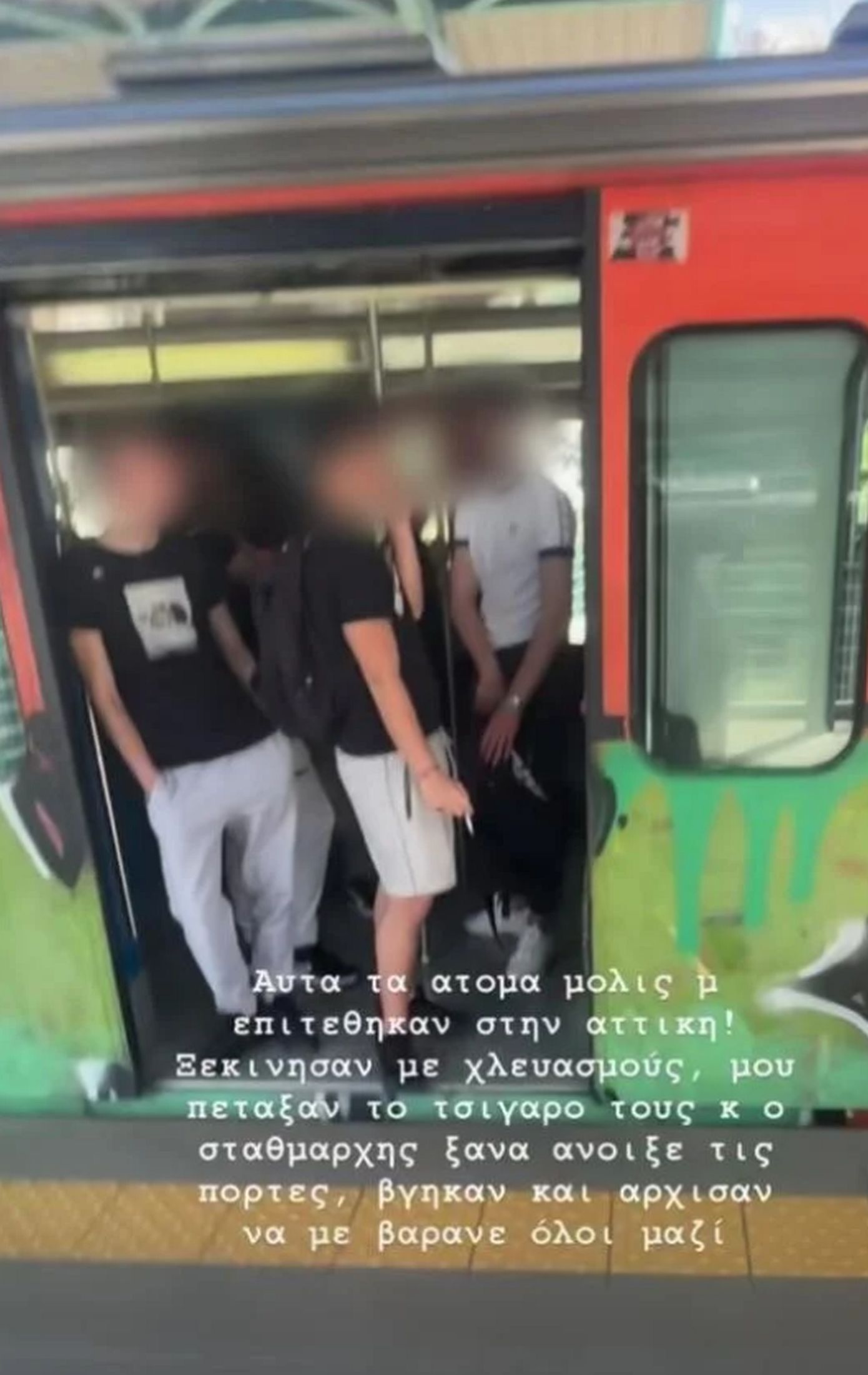 «Μέσα κάθονταν τρία νεαρά άτομα, που κάπνιζαν ανενόχλητα μέσα στο βαγόνι. Καθώς περνούσα, άρχισαν να με κοιτούν έντονα και να λένε σχόλια με σαφές ρατσιστικό υπονοούμενο. Προσπάθησα να τους αγνοήσω, να μην δώσω σημασία. Όμως, λίγο πριν κλείσουν οι πόρτες του συρμού, ένας από αυτούς μου πέταξε το τσιγάρο του. Εκεί γύρισα και του είπα: «Τι πρόβλημα έχεις ρε μαλ@@@;».