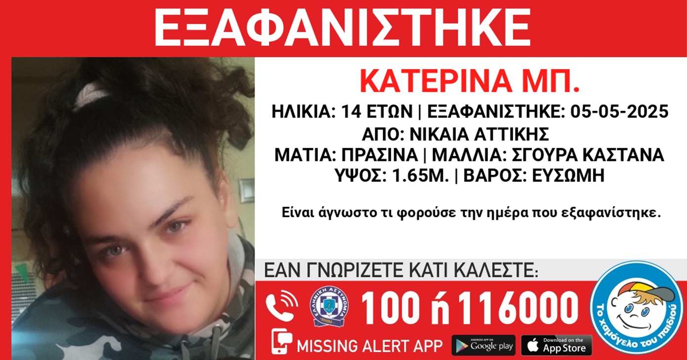 Πρόκειται για την 14χρονη Κατερίνα Μπ. που τα ίχνη της χάθηκαν το πρωί της Δευτέρας 05/05.