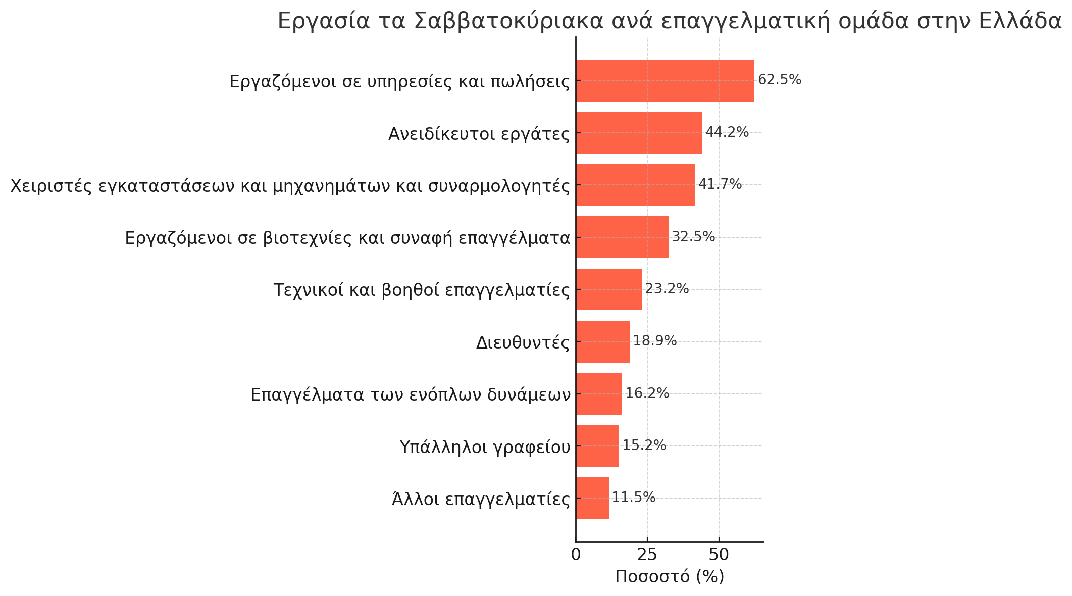 Στην Ελλάδα, πιο έντονη είναι η παρουσία εργασίας το Σαββατοκύριακο σε επαγγέλματα όπως σερβιτόροι και μάγειρες, οδηγοί ταξί ή φορτηγών, εργαζόμενοι σε καταστήματα λιανικής και τουριστικές επιχειρήσεις, αλλά και σε ελεύθερους επαγγελματίες που εξυπηρετούν πελάτες εκτός κανονικού ωραρίου.