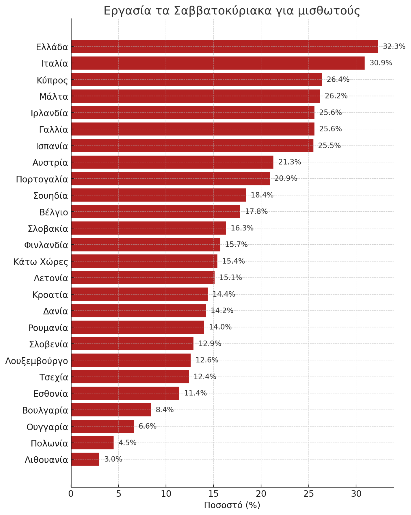 Το 2023, η χώρα μας παρουσίασε το υψηλότερο ποσοστό μισθωτών που εργάζονται κατά κανόνα τα Σαββατοκύριακα, αγγίζοντας το 32,3% – σημαντικά υψηλότερο από τον ευρωπαϊκό μέσο όρο, που διαμορφώνεται στο 22,4%.