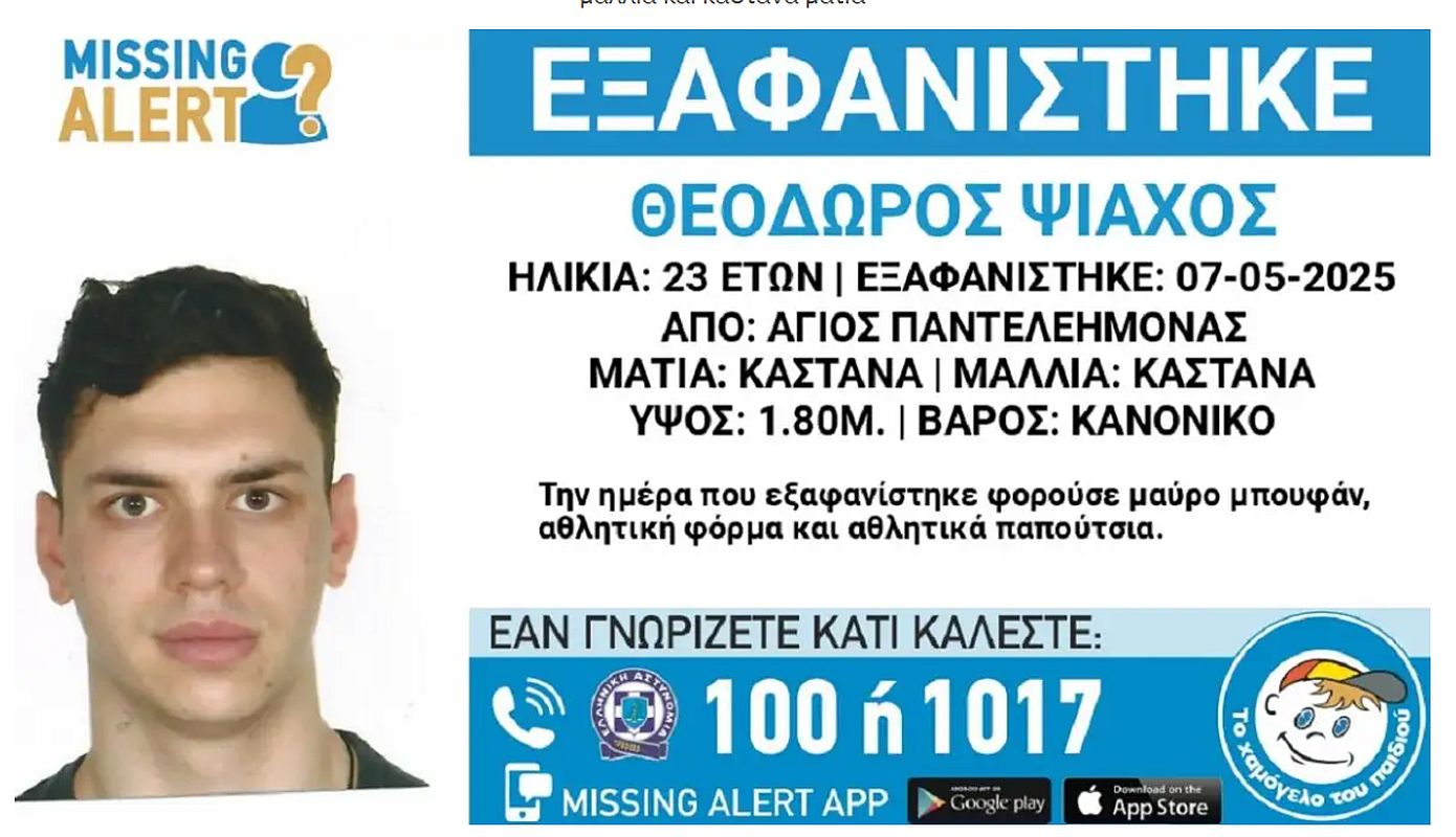 Συναγερμός έχει σημάνει στις Αρχές από την εξαφάνιση του 23χρονου Θεόδωρου Ψιάχου το βράδυ της Τετάρτης (07/05/2025) από τον Άγιο Παντελεήμονα, όμως ανακοίνωσε το «Χαμόγελο του Παιδιού».