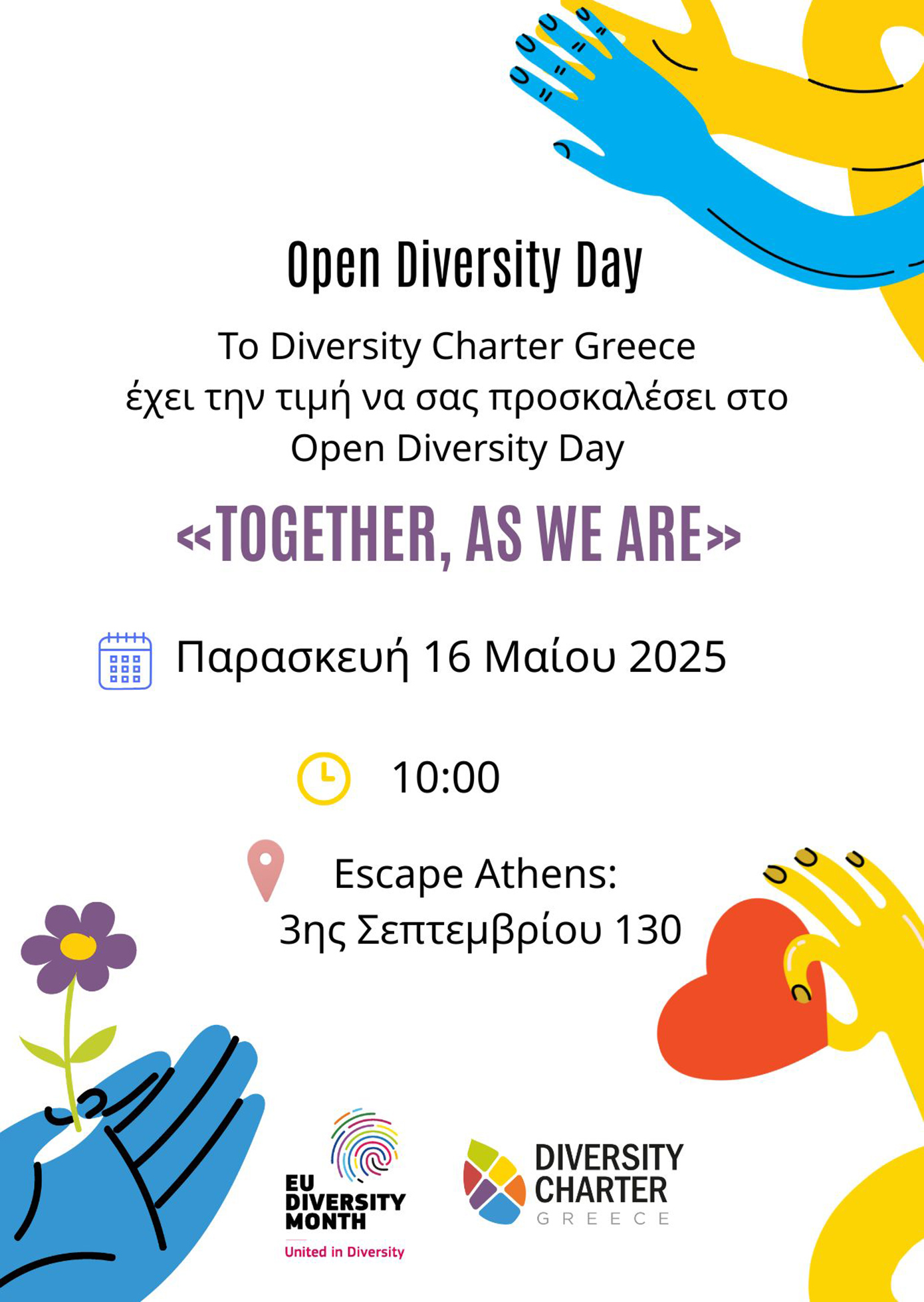 Η Χάρτα Διαφορετικότητας για τις ελληνικές επιχειρήσεις (Diversity Charter Greece) σας προσκαλεί στην εκδήλωση Open Diversity Day, με τίτλο «Together, As We Are», που θα πραγματοποιηθεί την Παρασκευή 16 Μαΐου 2025, και ώρα 10.00 πμ, στον πολυχώρο Escape Athens (3ης Σεπτεμβρίου & Κοδριγκτώνος, 10434, Αθήνα).