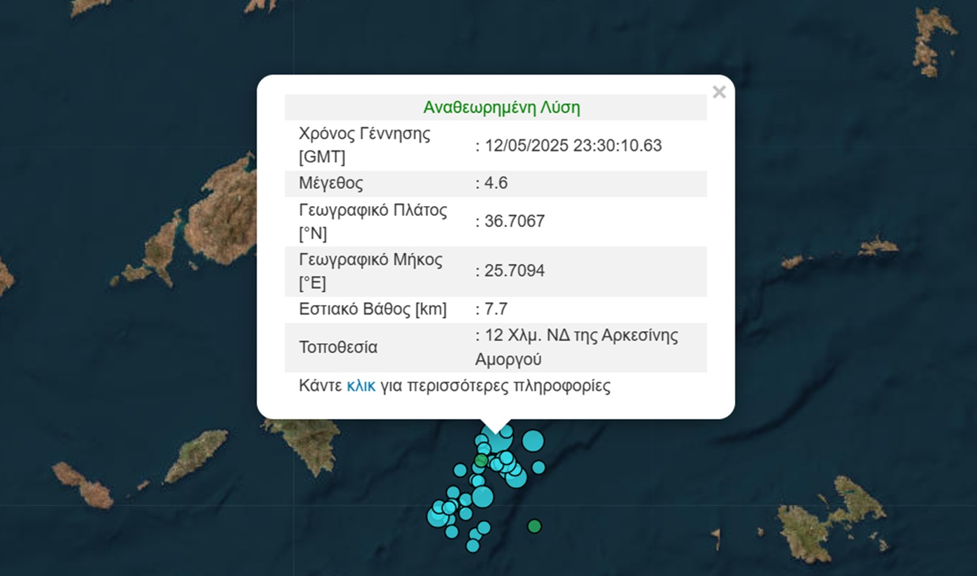 Όπως αναφέρει το Γεωδυναμικό Ινστιτούτο, το επίκεντρο της δόνησης εντοπίστηκε 12 χιλιόμετρα νοτιοδυτικά της Αρκεσίνης στην Αμοργό, ενώ το εστιακό βάθος υπολογίστηκε στα 7,7 χιλιόμετρα.