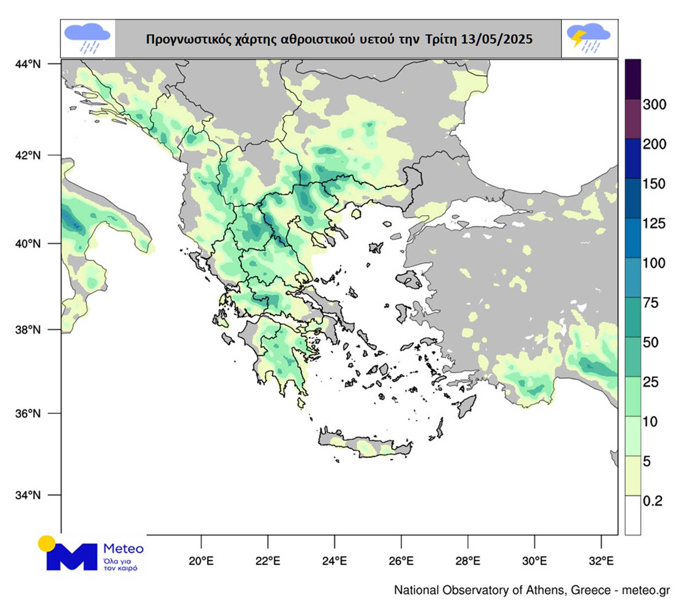 Στον προγνωστικό χάρτη που ακολουθεί παρουσιάζονται τα εκτιμώμενα αθροιστικά ύψη υετού (βροχές/καταιγίδες) κατά τη διάρκεια της Τρίτης 13/05:
