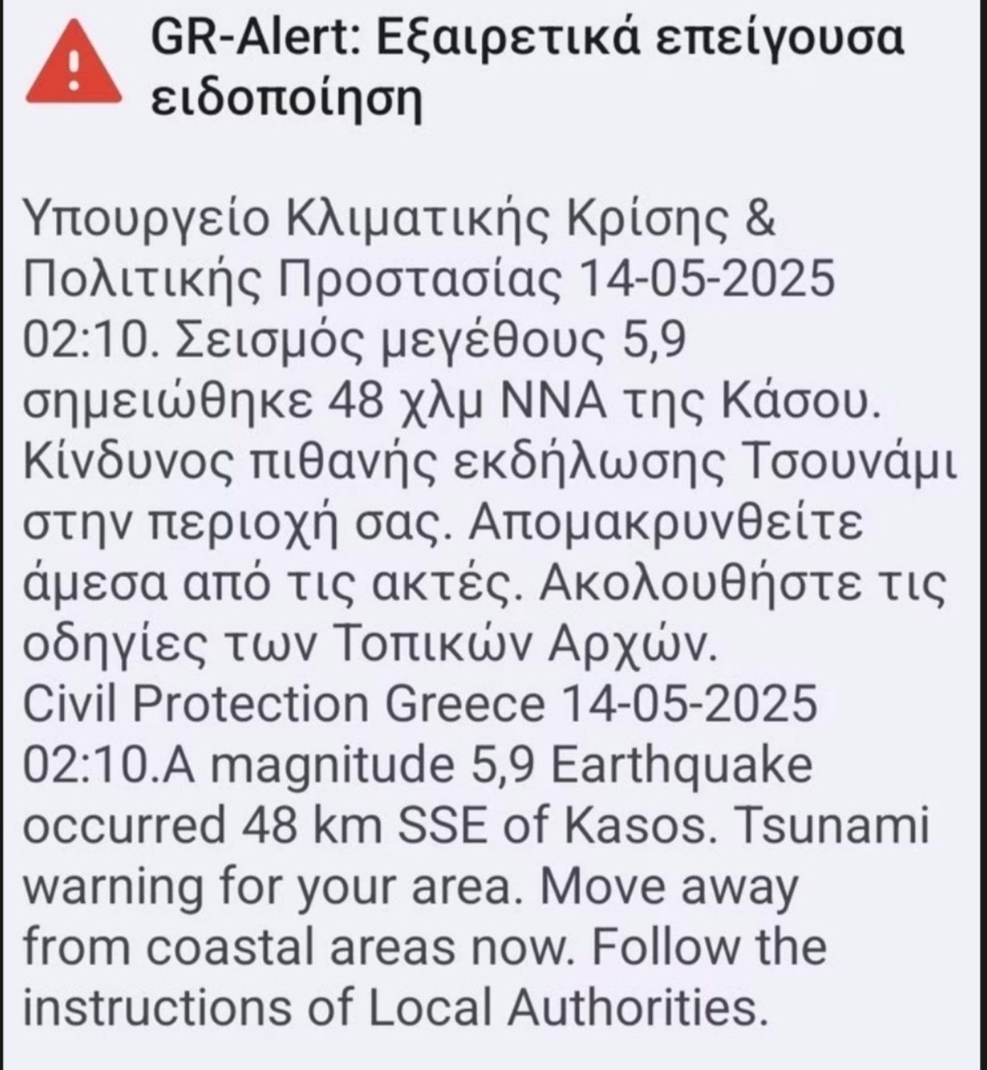 🆘 Σεισμός μεγέθους 5.9 σημειώθηκε 48χλμ ΝΝΑ της Κάσου. Κίνδυνος πιθανής εκδήλωσης Τσουνάμι στην περιοχή σας