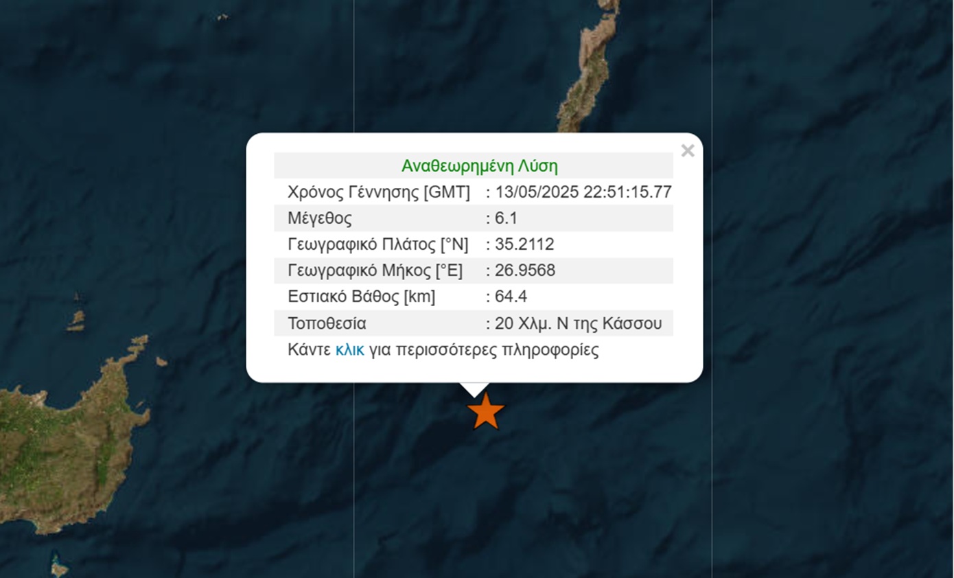 Ισχυρή σεισμική δόνηση 6,1 Ρίχτερ ταρακούνησε τα ξημερώματα της Τετάρτης 14/05 την θαλάσσια περιοχη ανάμεσα στην Κάσο και την Κάρπαθο.