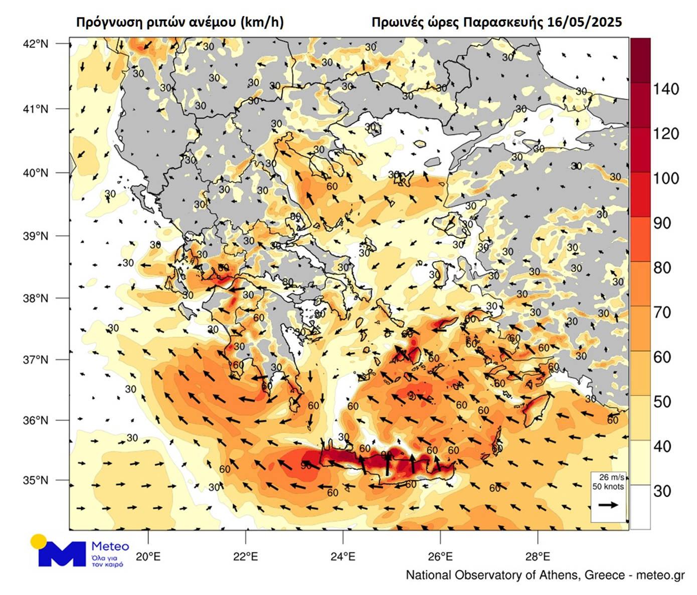 Τοπικά θυελλώδεις νοτιοανατολικοί άνεμοι 8 με ριπές έως 9 μποφόρ στο Αιγαίο και την Κρήτη και μέχρι το μεσημέρι στο νότιο Ιόνιο και τη νότια Πελοπόννησο.