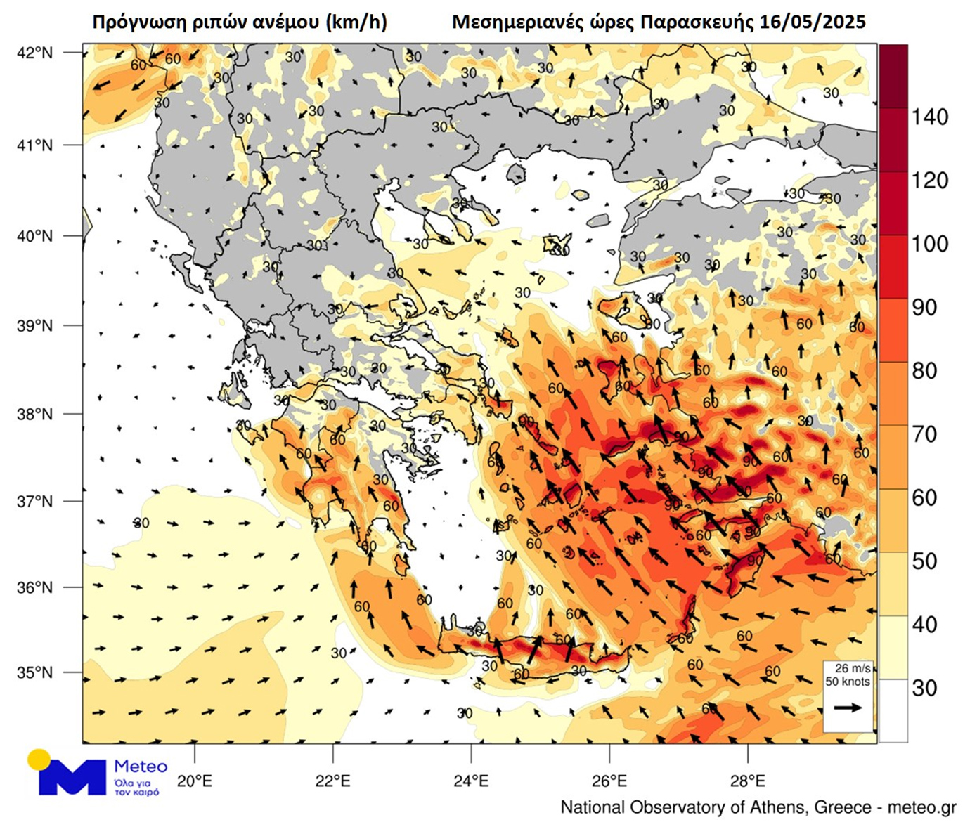 Οι μετεωρολογικές συνθήκες ευνοούν τη μεταφορά αφρικανικής σκόνης στη νότια χώρα (κυρίως σε Κρήτη, Κυκλάδες, Δωδεκάνησα και νότια Πελοπόννησο).