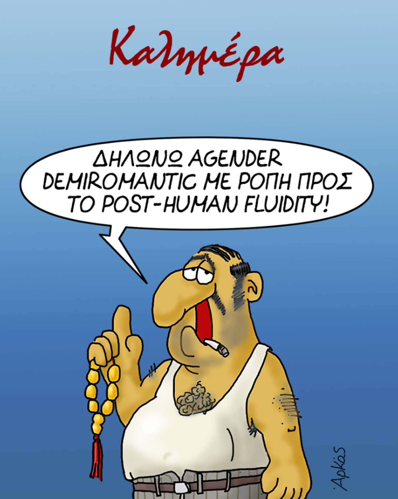 Πιο συγκεκριμένα γράφει στη λεζάντα του σκίτσου: «Δηλώνω agender, demiromantic, με ροπή προς το post – human fluidity».