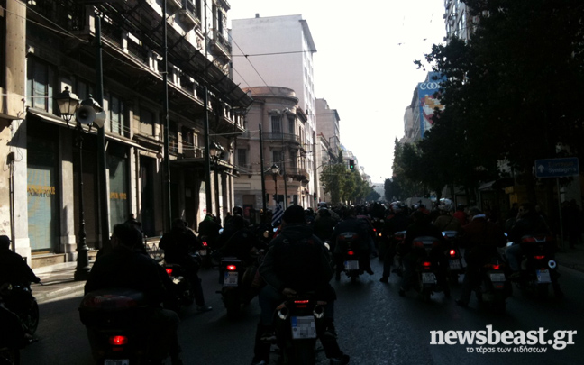 Περισσότερα από 150 μηχανάκια κινούνται αυτή την ώρα στην οδό Σταδίου. Οι οδηγοί κατευθύνονται στη Βουλή. Η οδός Σταδίου αυτή την ώρα παραμένει κλειστή λόγω της πορείας.