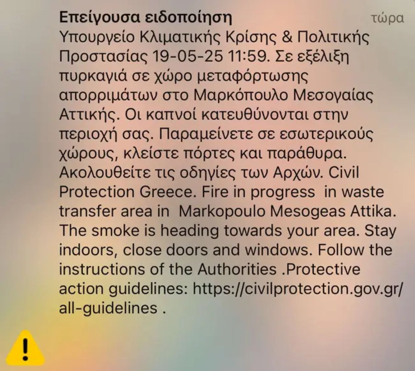 Μήνυμα 112 για τη φωτιά στο Μαρκόπουλο εστάλη από την Πολιτική Προστασία, προειδοποιώντας για τους καπνούς που προέρχονται από την εστία στον χώρο απορριμάτων.