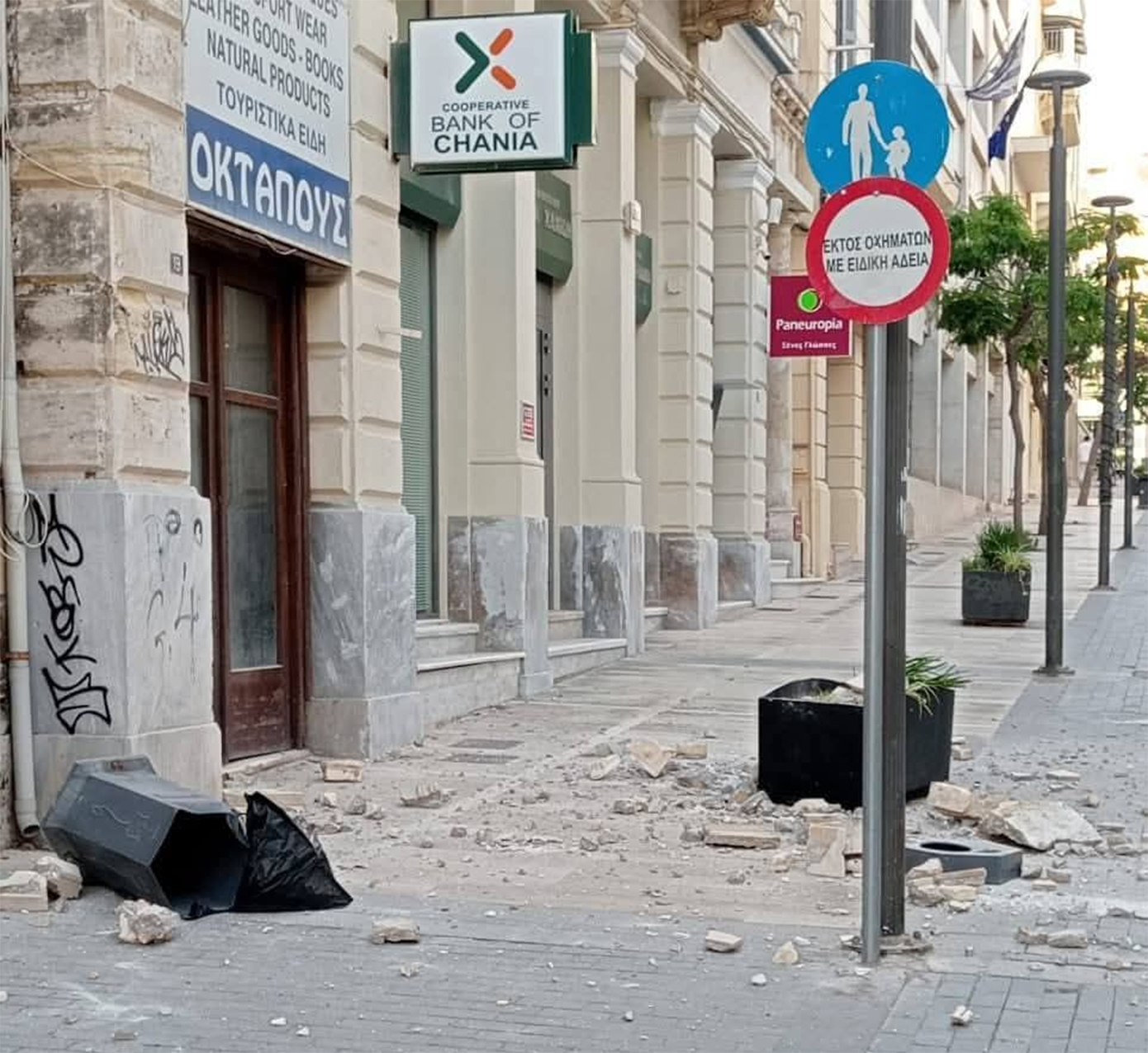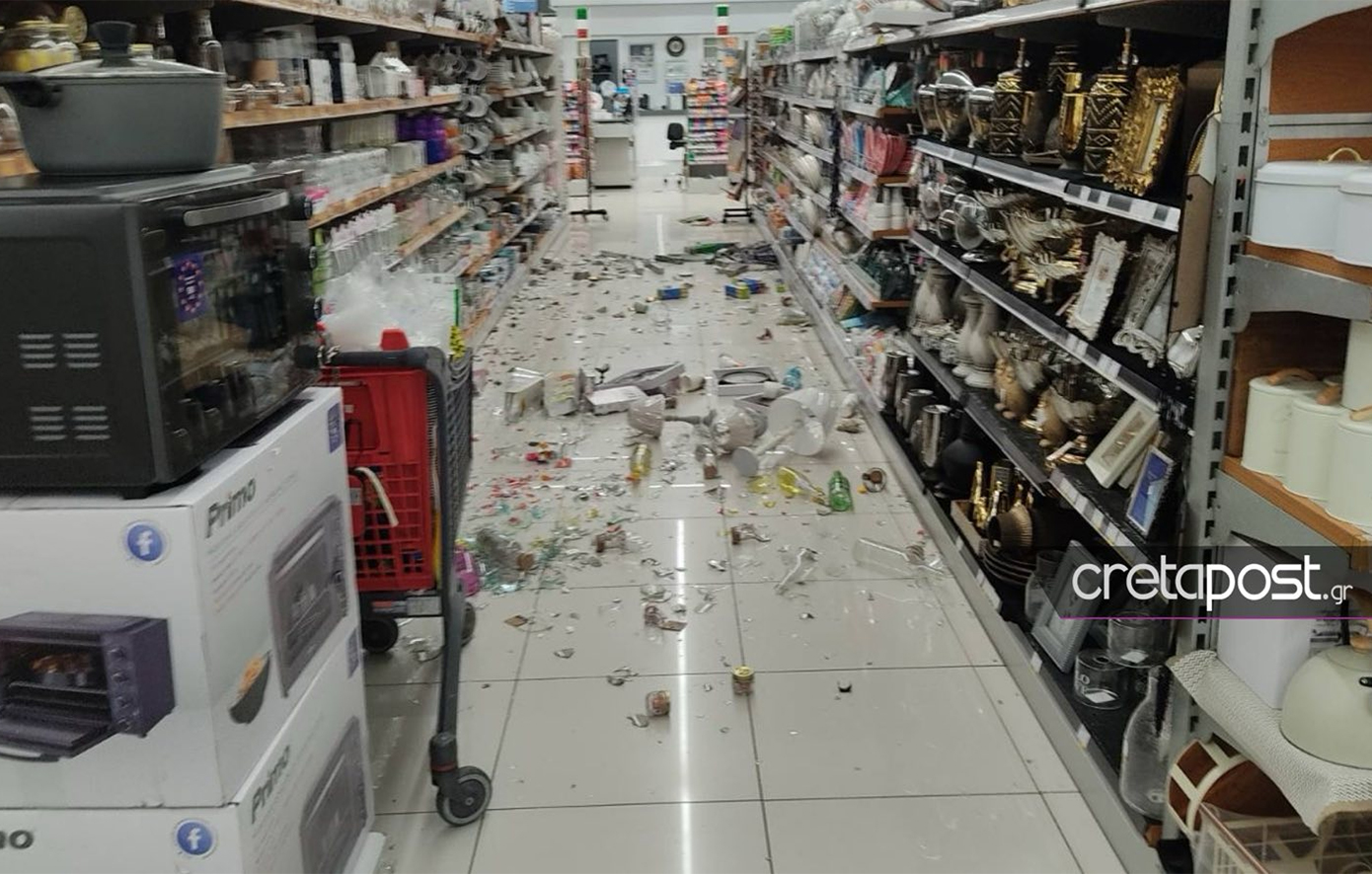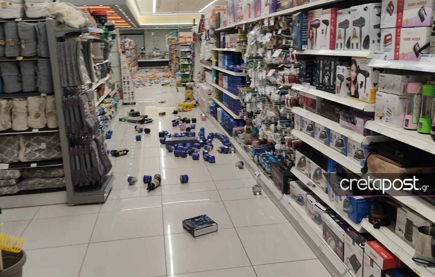 Προϊόντα έπεσαν από τα ράφια των σούπερ μάρκετ, ενώ τμήμα κτιρίου έπεσε στο Ηράκλειο στον πεζόδρομο της 25ης Αυγούστου. Άμεσα στο σημείο βρέθηκαν υπάλληλοι της δημοτικής αστυνομίας που απέκλεισαν τον χώρο, ενώ εξετάζονται και άλλες περιοχές.