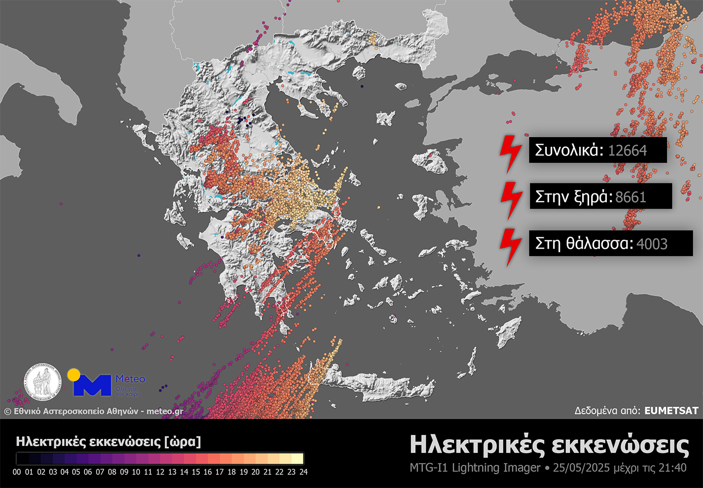 Σημειώνεται πως οι καταιγίδες που εκδηλώθηκαν την Κυριακή 25/05, κυρίως στα ηπειρωτικά τμήματα της χώρας, συνοδεύτηκαν και από σημαντική ηλεκτρική δραστηριότητα.