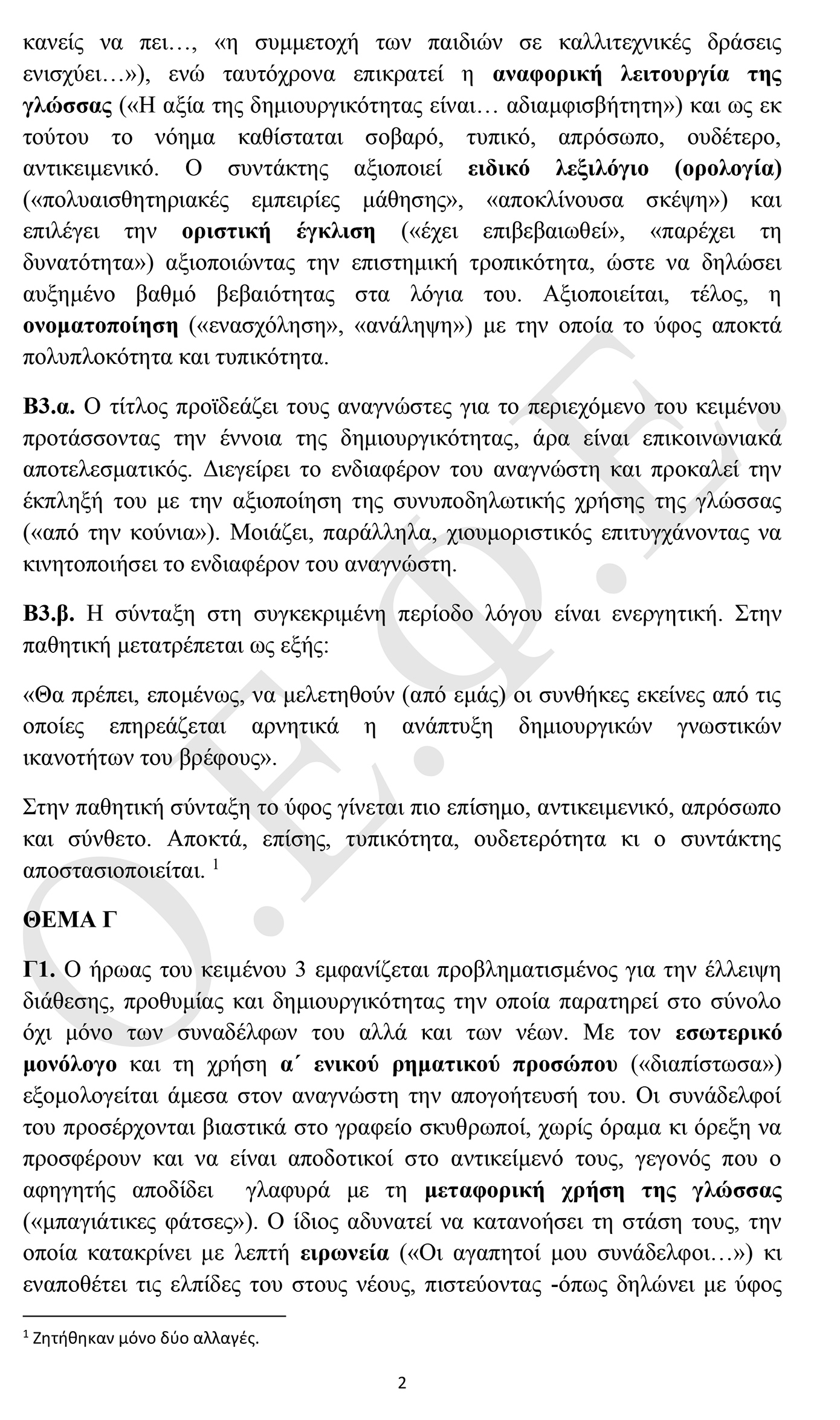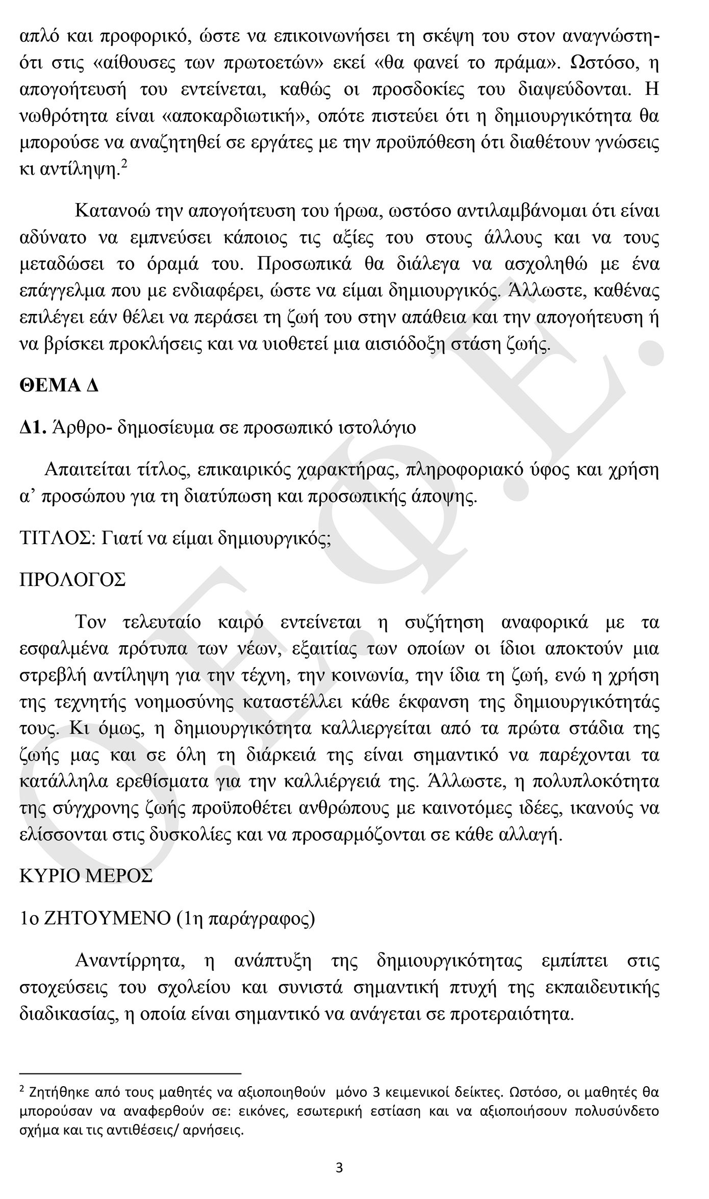 «Το θέμα το οποίο κλήθηκαν να διαχειριστούν στο μάθημα της Νεοελληνικής Γλώσσας και Λογοτεχνίας οι υποψήφιοι των Γενικών Λυκείων αφορά στη δημιουργικότητα των μαθητών, εστιάζοντας στους λόγους καλλιέργειάς της από το σχολείο και στους τρόπους με τους οποίους καθένας την εκφράζει σε προσωπικό επίπεδο (Θέμα Δ).