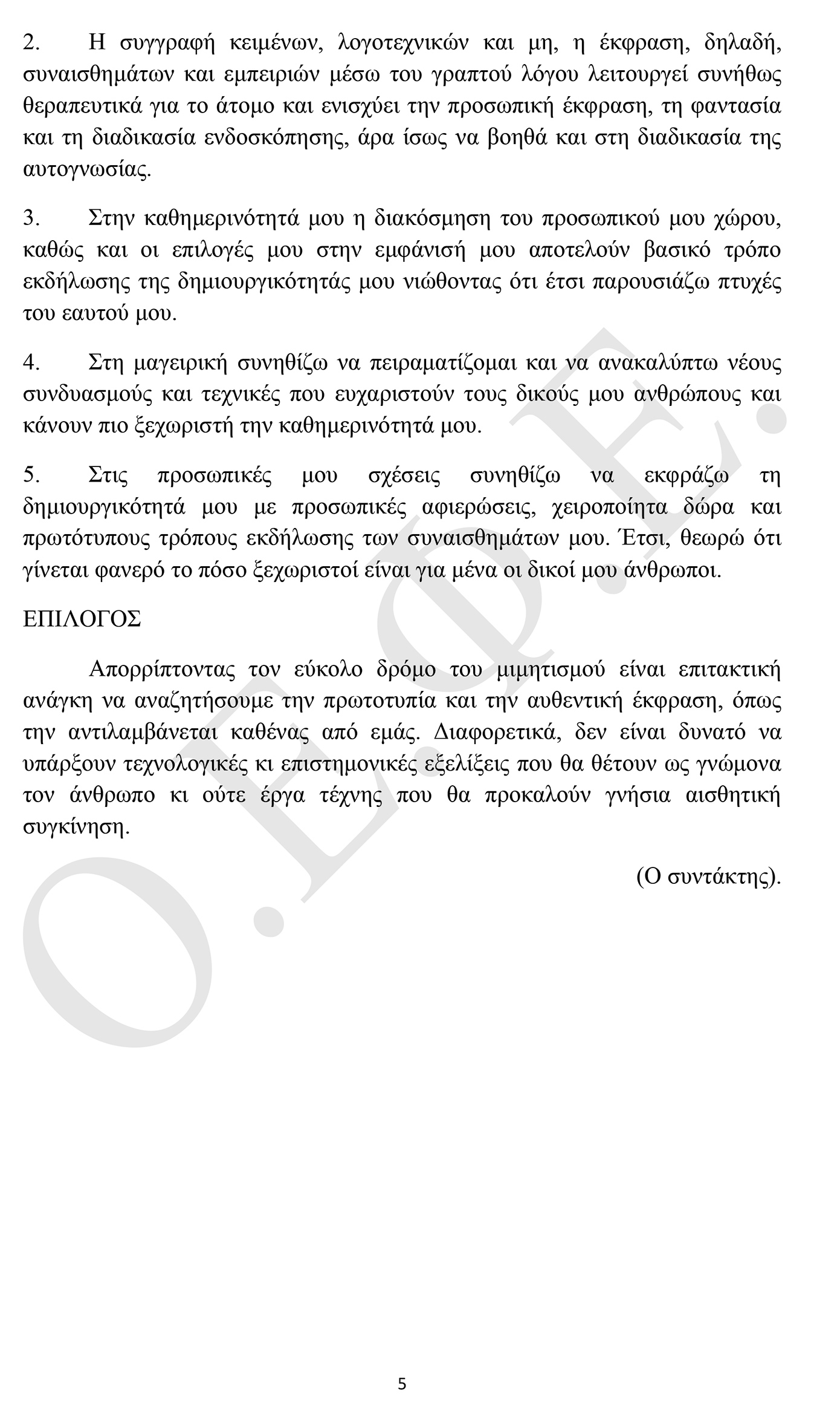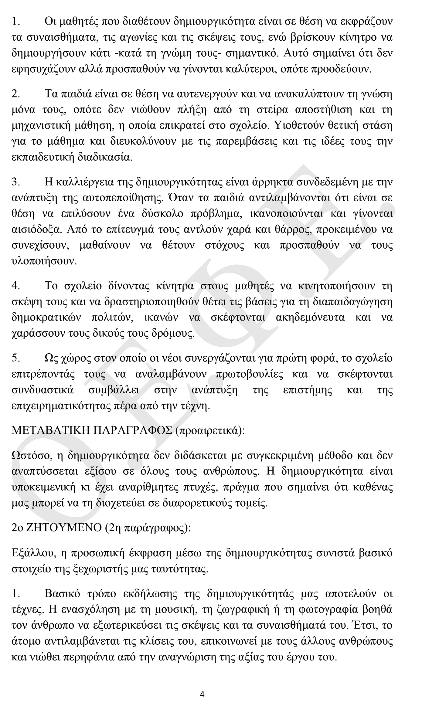 Οι υποψήφιοι, πέραν των ερωτήσεων συντακτικού, λεξιλογίου και ερμηνείας, κλήθηκαν να γράψουν ένα άρθρο για το προσωπικό τους ιστολόγιο, 350-400 λέξεων, όπου θα αναφέρονται οι λόγοι για τους οποίους το σύγχρονο σχολείο οφείλει να καλλιεργεί τη δημιουργικότητα των μαθητών/ μαθητριών και οι τρόποι με τους οποίους οι ίδιοι επιλέγουν στην προσωπική τους ζωή να εκφράσουν τη δημιουργικότητά τους.