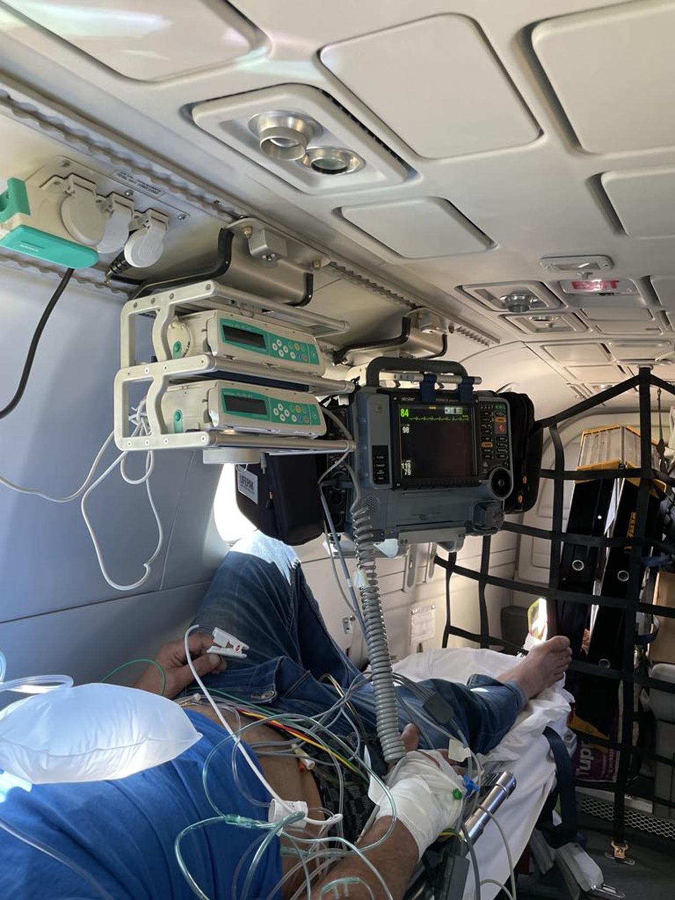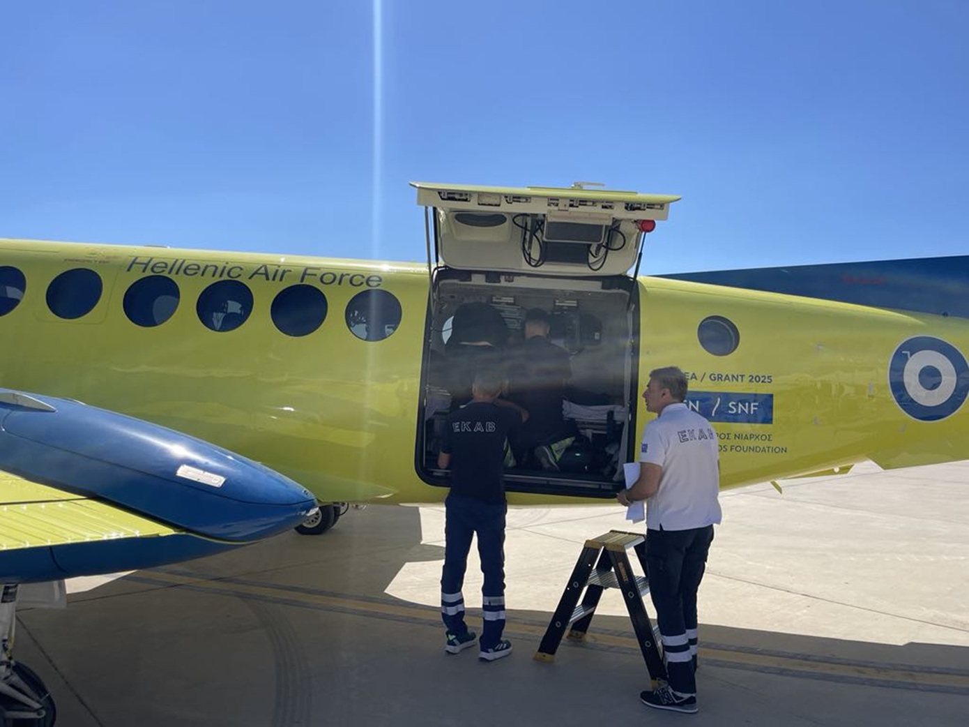 Καθ’ οδόν προς τη Μυτιλήνη μεταφέροντας τον γιατρό, το πλήρωμα του αεροπλάνου του ΕΚΑΒ ενημερώθηκε ότι έπρεπε να περάσει από τη Σαντορίνη για να παραλάβει 49χρονο Αιγύπτιο εργάτη στο νησί που είχε υποστεί οξύ και εκτεταμένο έμφραγμα του μυοκαρδίου.