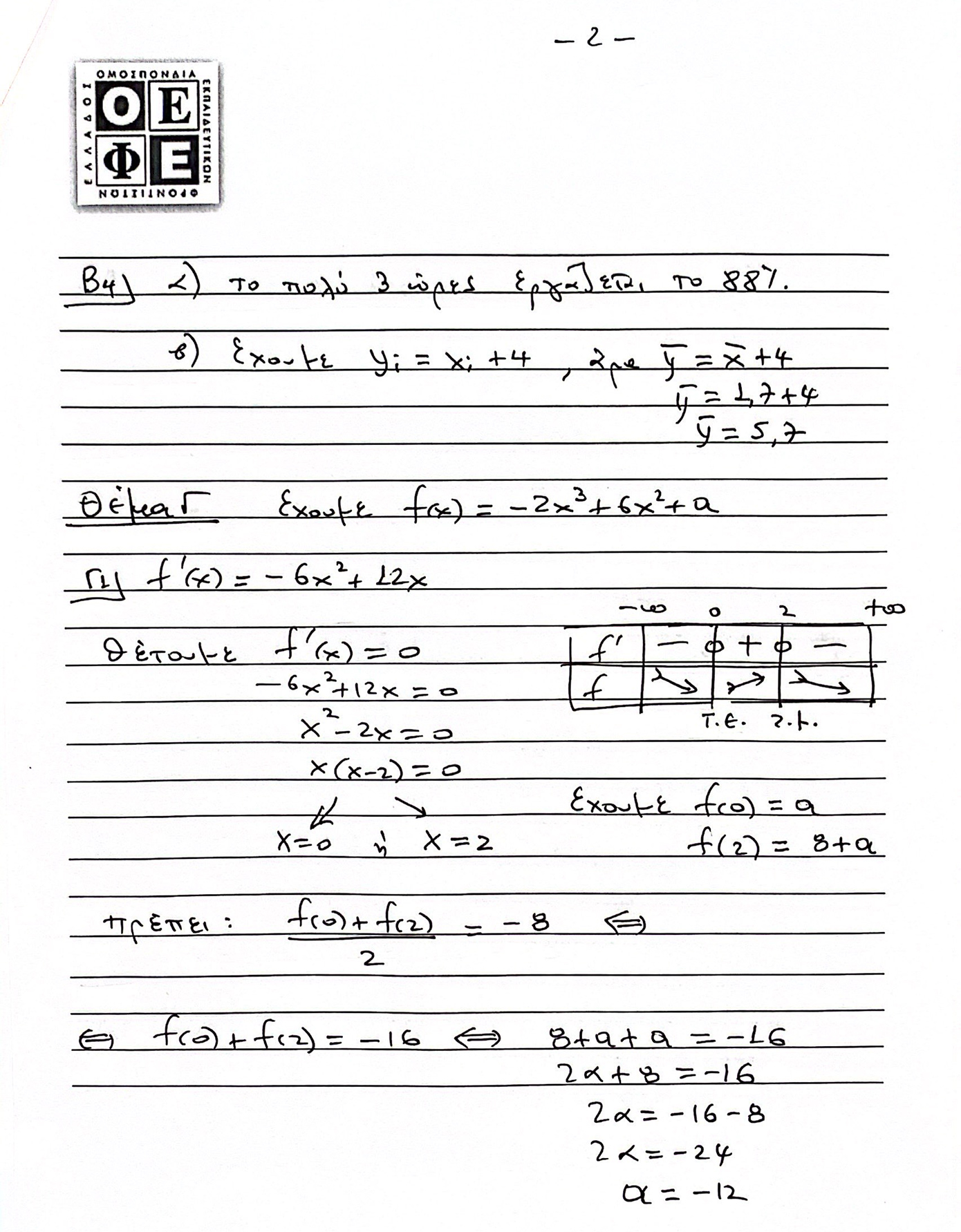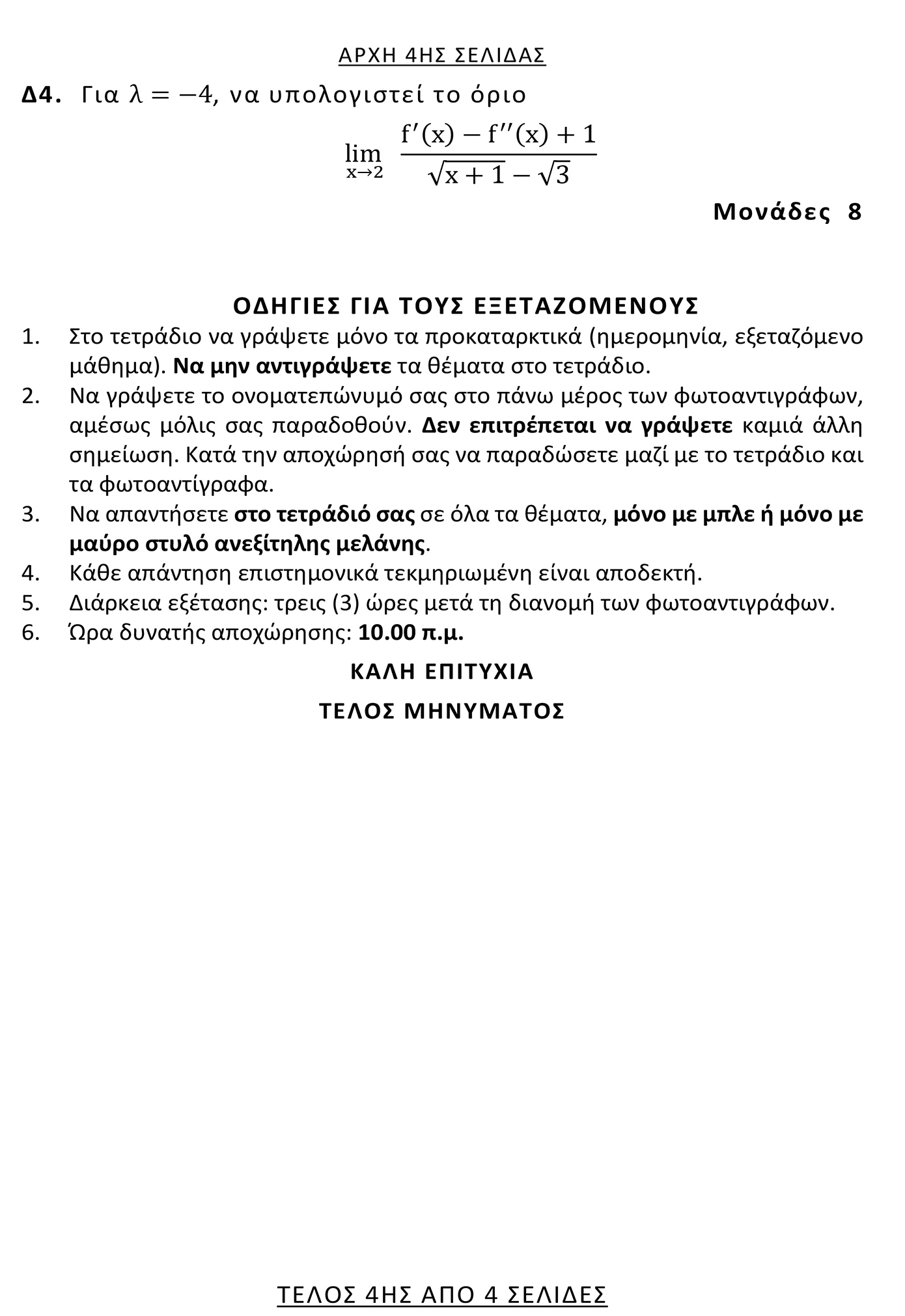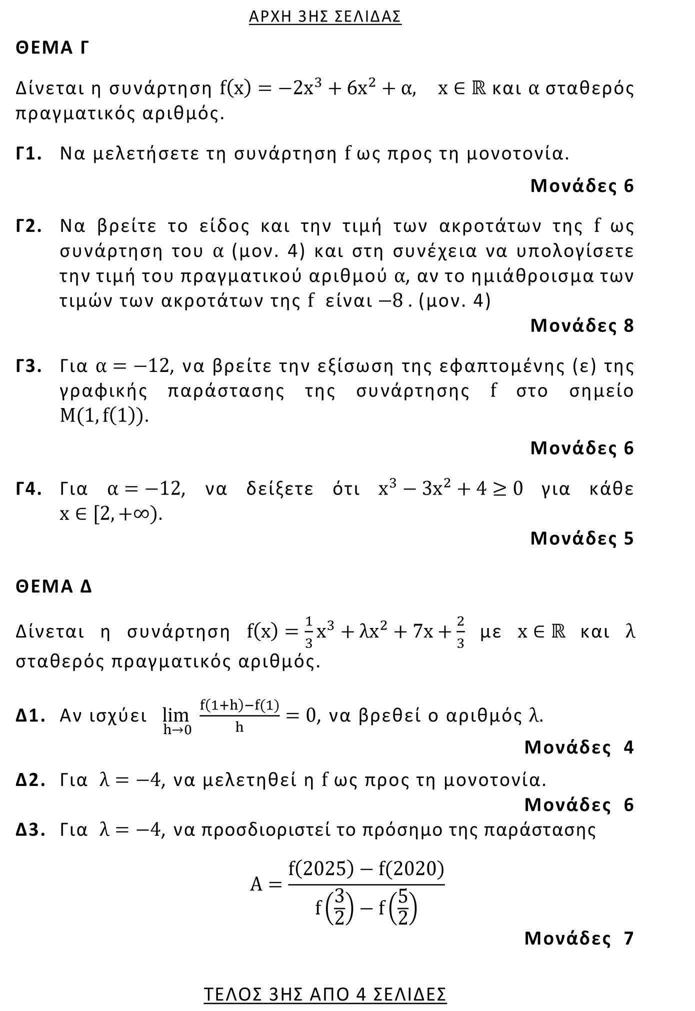 Θέμα Δ: Θέμα διαφορικού λογισμού, αυξημένης δυσκολίας. Το ερώτημα Δ3 θα προβληματίσει αρκετούς υποψηφίους».