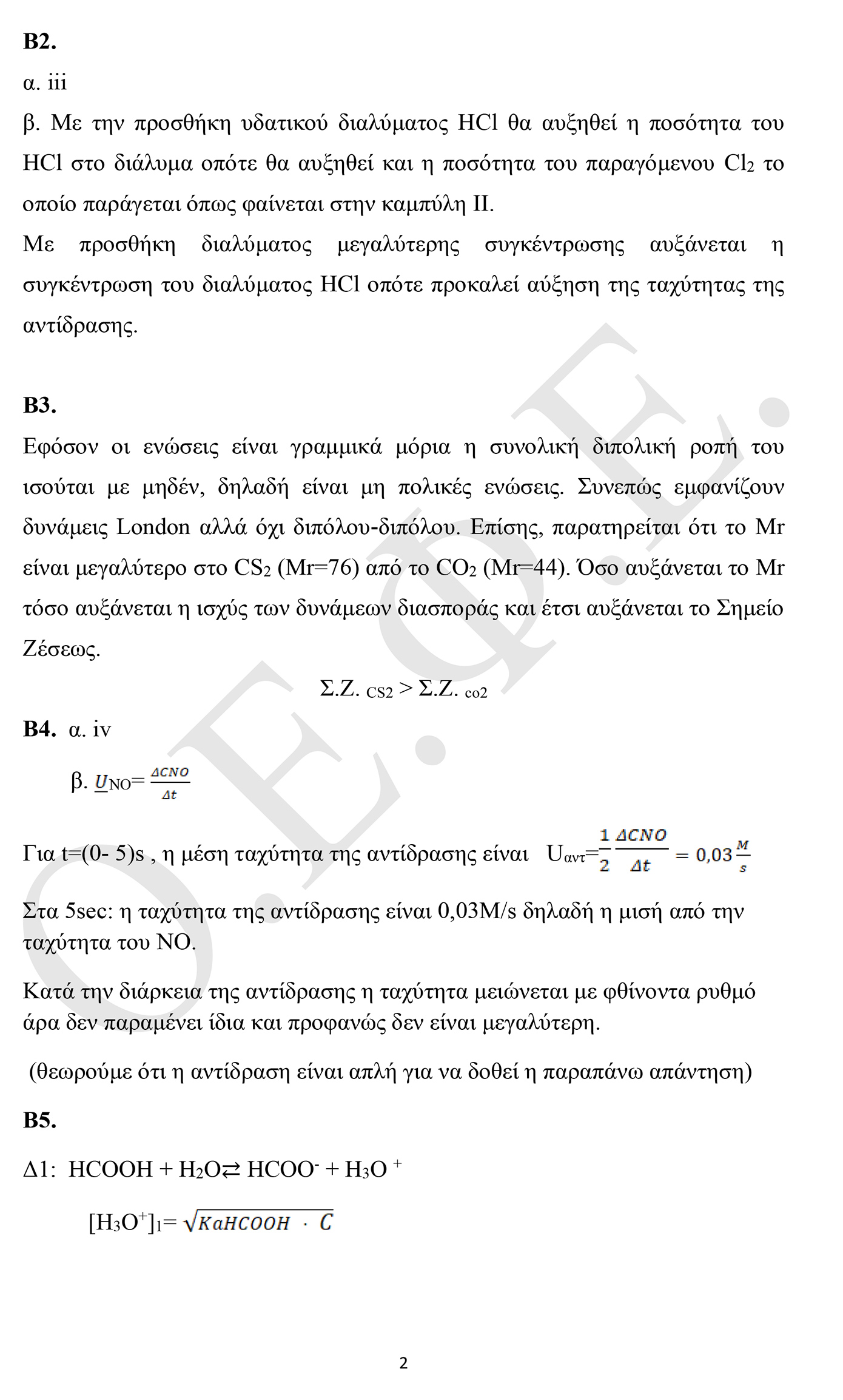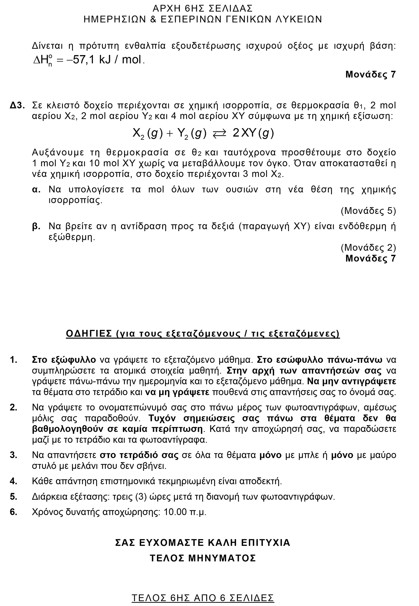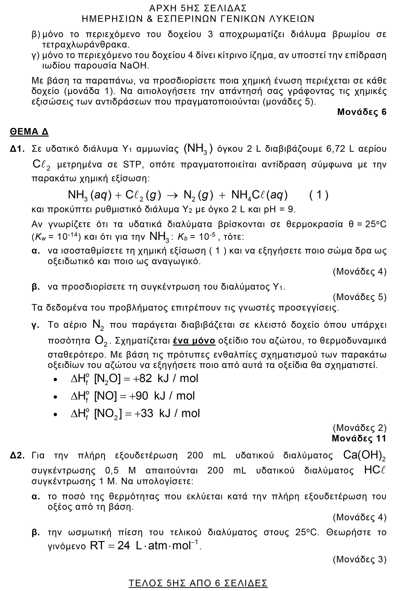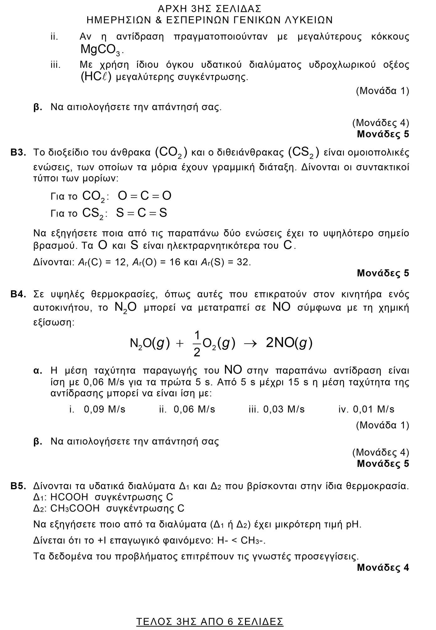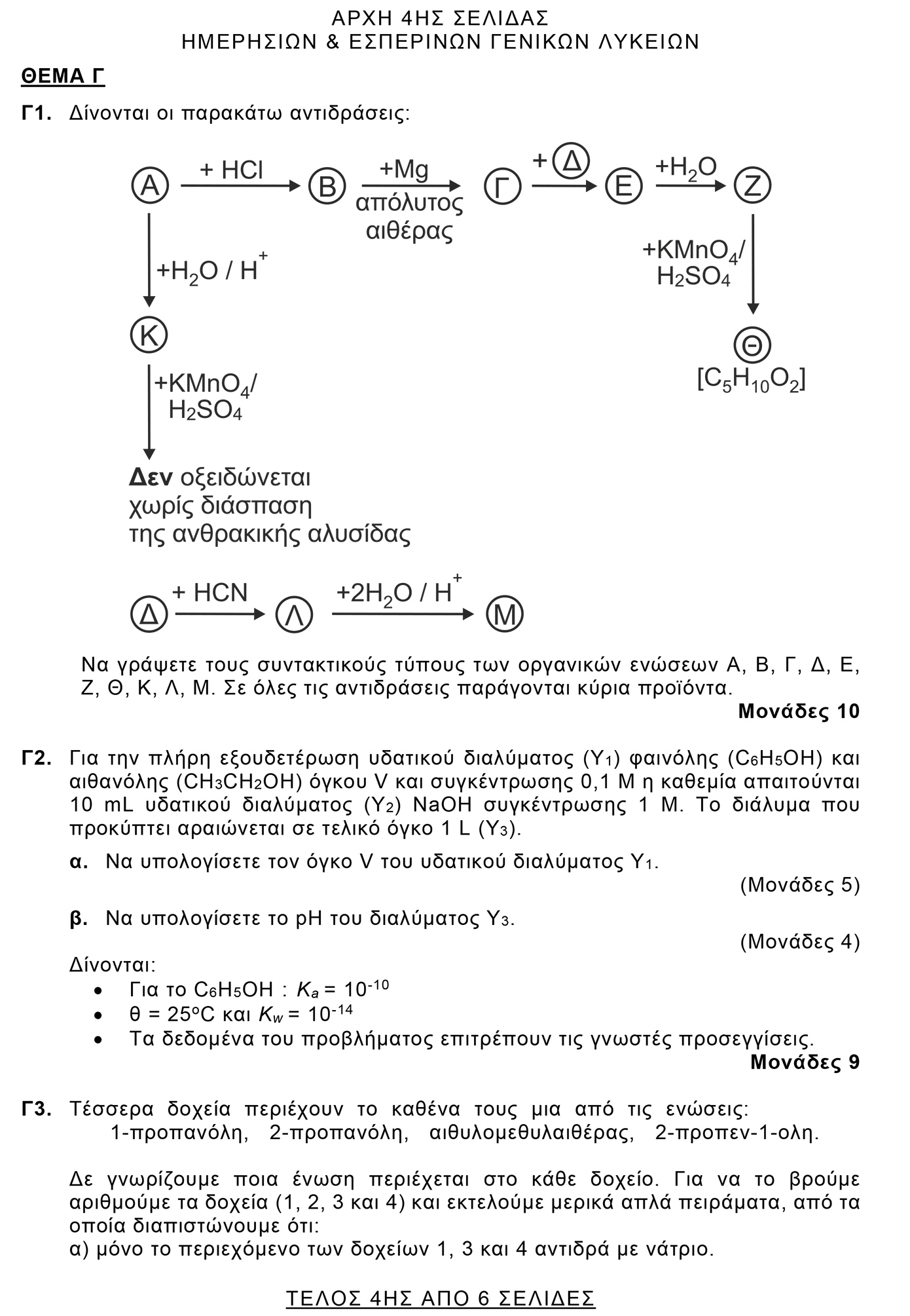 «Τα θέματα της Χημείας μπορούν να χαρακτηριστούν μέτριας δυσκολίας, με αναμενόμενη διακύμανση των λεπτομερειών κατά την επίλυση των ερωτημάτων κάθε θέματος. Το πρώτο θέμα δεν παρουσιάζει δυσκολίες για τους υποψηφίους οι οποίοι έχουν ασχοληθεί επαρκώς όλη τη χρονιά. Το δεύτερο θέμα στην πλειονότητα των ερωτημάτων του έχει αναμενόμενες απαντήσεις με λίγες λεπτομέρειες, οι οποίες χρειάζονται προσοχή. Το τρίτο και τέταρτο θέμα απαιτούν καλή γνώση των αντίστοιχων δεδομένων των κεφαλαίων και προσοχή στις λεπτομέρειες στο τέλος των απαντήσεων».