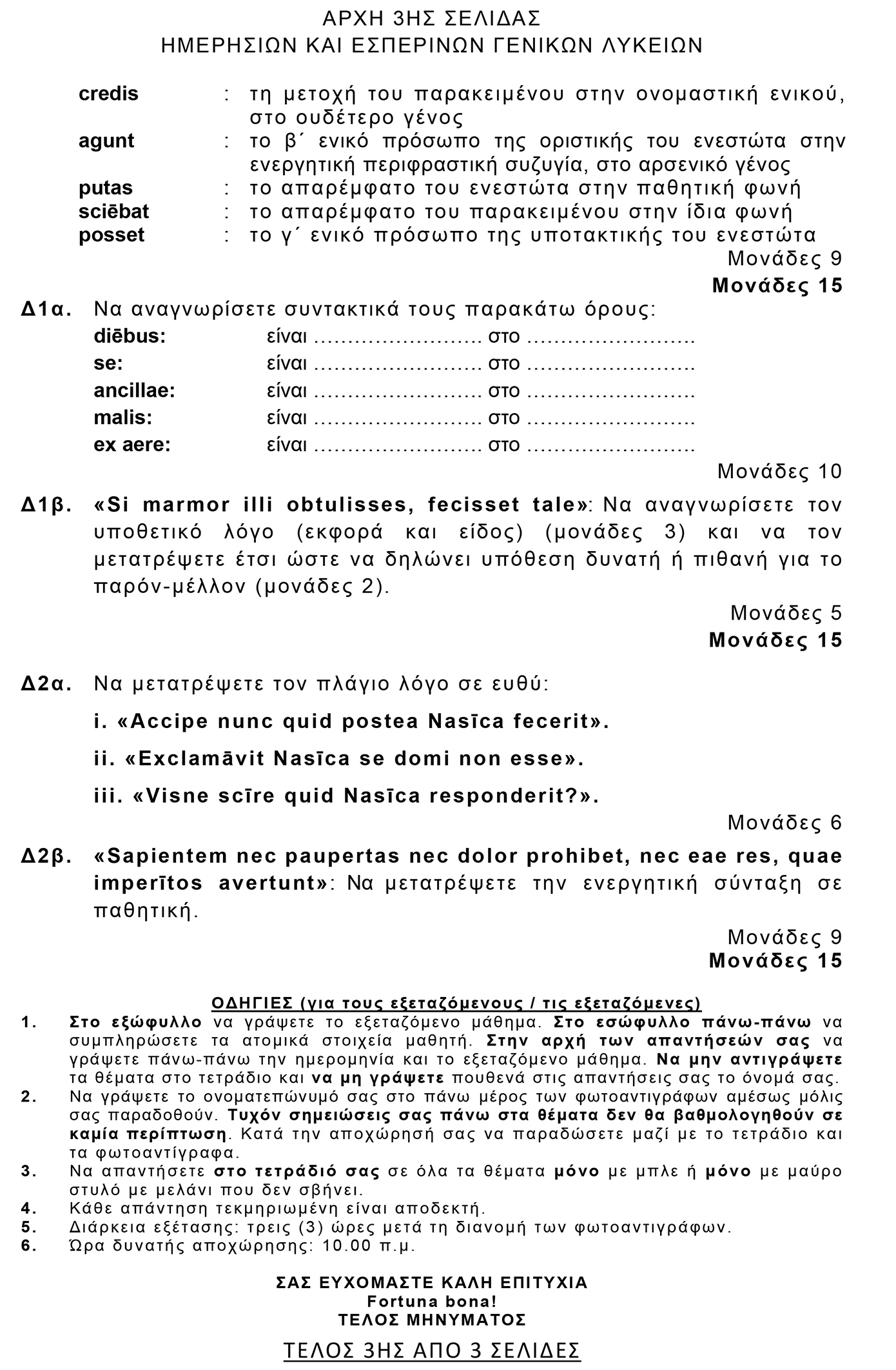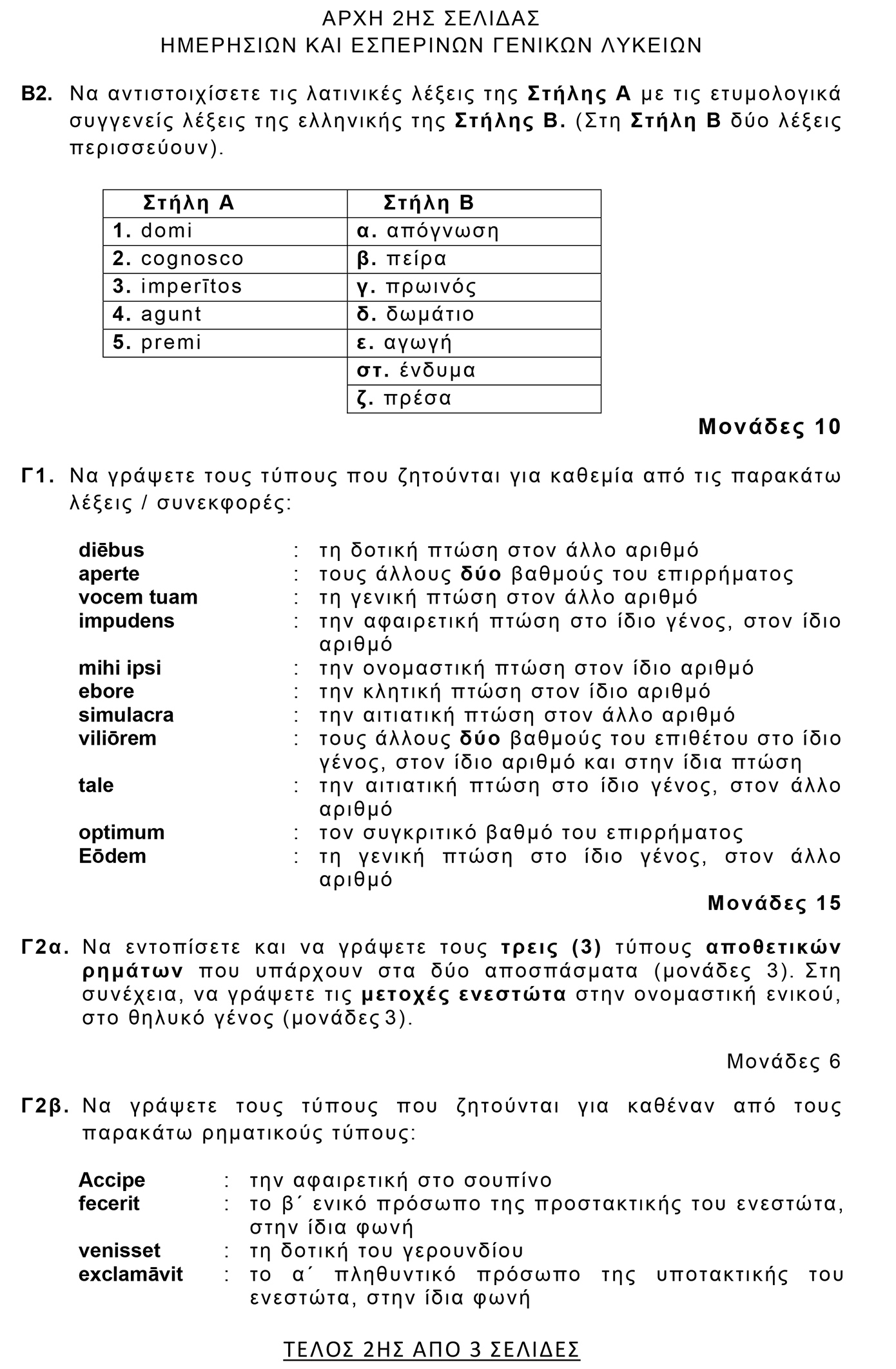 «Τα σημερινά θέματα των Λατινικών χαρακτηρίζονται ως σαφή και ξεκάθαρα. Δόθηκαν αποσπάσματα από τα κείμενα 24 και 39 και η μετάφραση που ζητήθηκε είναι απλή, χωρίς ιδιαιτερότητες και προβλήματα. Η ερώτηση εισαγωγής (Β1) ήταν κλειστού τύπου (με τη μορφή Σωστού Λάθους) και δεν αναμένεται να δυσκολέψει ιδιαίτερα τους μαθητές παρόλο που υπεισήλθε σε λεπτομέρειες. Η λεξιλογική άσκηση (Β2) κινήθηκε σε αναμενόμενα επίπεδα. Ζητήθηκε από τους μαθητές να αντιστοιχίσουν τις λατινικές λέξεις της μιας στήλης με τις ελληνικές της άλλης όπου όμως περίσσευαν δύο λέξεις. Οι ερωτήσεις της Γραμματικής (Γ1, Γ2), εξέταζαν αρκετά μεγάλο μέρος της ύλης, ήταν διαβαθμισμένης δυσκολίας, χωρίς όμως να υπάρχει η πολύ δύσκολη άσκηση ή να ζητείται κάποια εξεζητημένη εξαίρεση. Οι ασκήσεις του Συντακτικού (Δ1, Δ2), δεν παρουσιάζουν κάποια ιδιαίτερη δυσκολία. Η Δ1 κινήθηκε στο κλασικό μοτίβο αφού ζητούσε αναγνώριση συντακτικών όρων και αναγνώριση δευτερεύουσας πρότασης. Η Δ2α ζήτησε τη μετατροπή από τον πλάγιο λόγο σε ευθύ, άσκηση που δε ζητήθηκε τα τελευταία 4-5 χρόνια. Πιο συγκεκριμένα, ζητήθηκε να μετατραπούν δύο πλάγιες ερωτήσεις σε ευθείες κι ένα ειδικό απαρέμφατο σε κύρια πρόταση κρίσεως. Η Δ2β ήταν συνηθισμένη μεν, επρόκειτο για μια απλή μετατροπή από ενεργητική σε παθητική σύνταξη, αρκετά απαιτητική δε γιατί έπρεπε να αλλάξουν 9 λέξεις. Οι καλά προετοιμασμένοι μαθητές και όσοι αντιμετώπισαν το μάθημα και την εξέταση με σοβαρότητα και ψυχραιμία δεν θα έχουν κανένα πρόβλημα να αριστεύσουν».