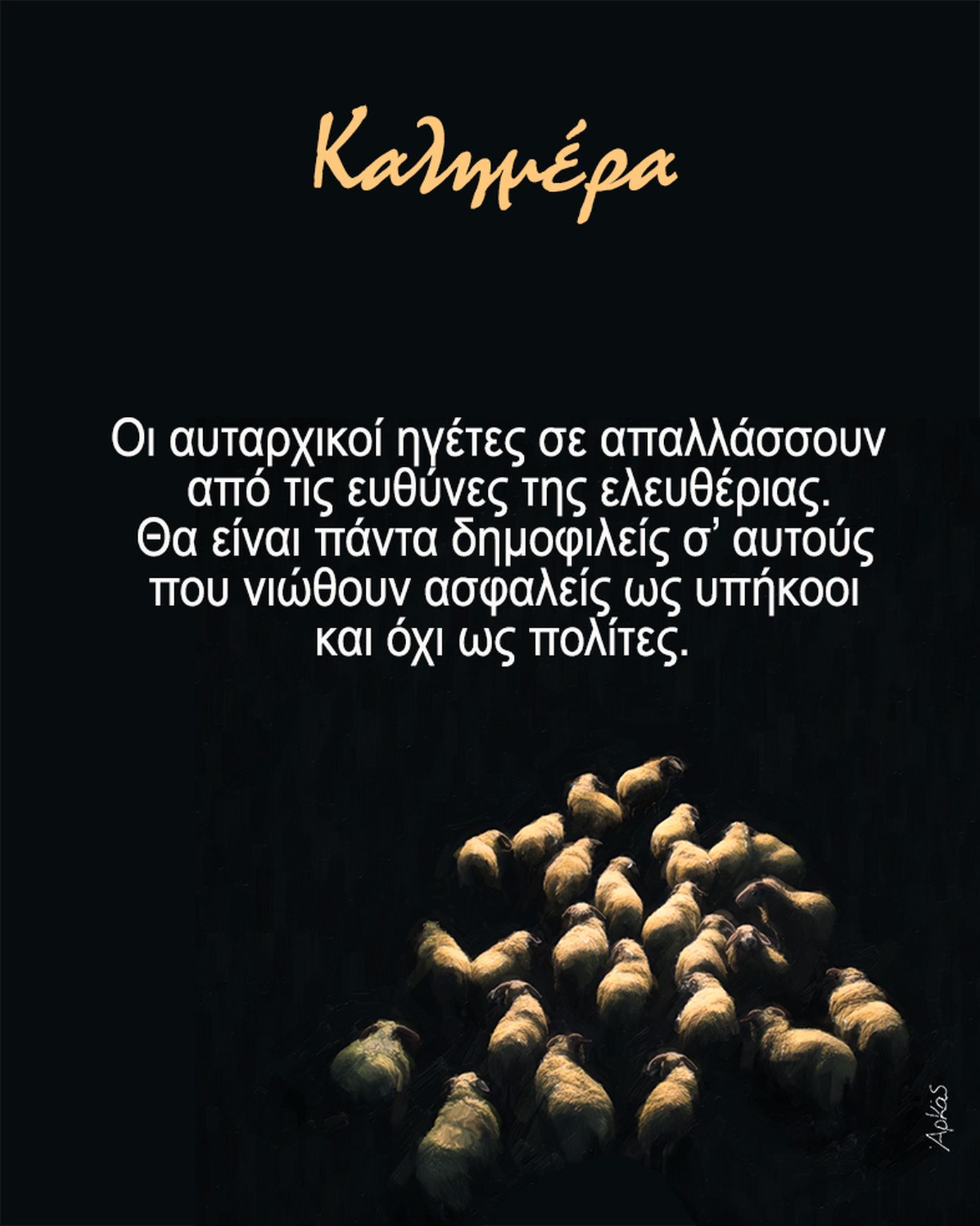 Γράφει, συγκεκριμένα, ο Αρκάς: «Οι αυταρχικοί ηγέτες σε απαλλάσσουν από τις ευθύνες της ελευθερίας.