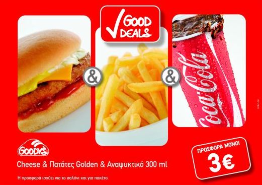 Στα εστιατόρια Goody’s οι καταναλωτές μπορούν να απολαύσουν το αγαπημένο τους Goody’s burger Ham ή Cheese, συνοδευόμενο πάντα με πατάτες και αναψυκτικό, μόνο με 3 ευρώ!