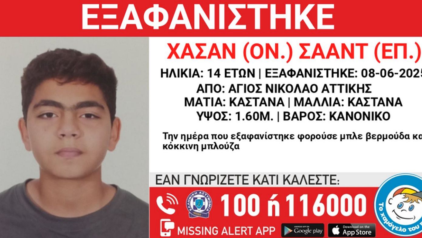 Συναγερμός έχει σημάνει για την εξαφάνιση ενός 14χρονου, αιγυπτιακής καταγωγής, στον Άγιο Νικόλαο, από χώρο φιλοξενίας ασυνόδευτων ανηλίκων, το απόγευμα της Κυριακής (08/06).