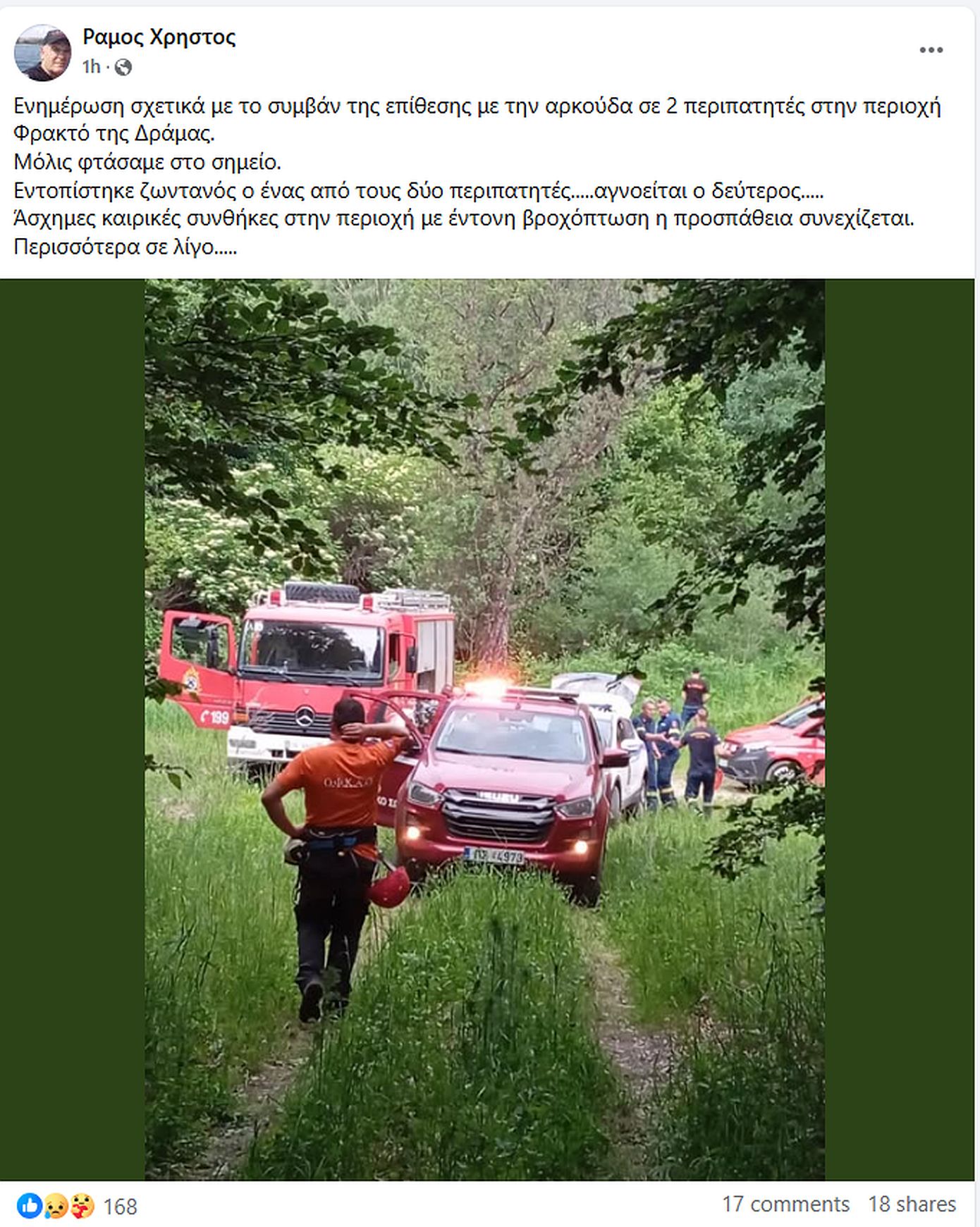 «Δύο φίλοι που είναι και στον Σύλλογο Δρομέων Δράμας, ανέβηκαν στο Παρθένο Δάσος Φρακτού μαζί με έναν σκύλο και εκεί τους επιτέθηκε η αρκούδα. Είχαν μαζί τους σπρέι πιπεριού και το χρησιμοποίησαν για να τη σταματήσουν. Η αρκούδα τους όρμηξε και αυτοί τράπηκαν σε φυγή. Ο ένας δεν έχει πάθει τίποτα, όμως ο δεύτερος έφυγε στον γκρεμό. Πρόκειται για έναν γκρεμό βάθους χιλίων μέτρων και δεν γνωρίζουμε που έχει φτάσει. Αν έχει σταματήσει κάπου. Δεν γνωρίζουμε σε τι κατάσταση είναι. Η περιοχή λέγεται Τζάκι Ρέμα. Οι δύο άνθρωποι πήγαν να επισκεφτούν ένα παλιό μαχητικό αεροπλάνο που έπεσε εκεί πριν από πολλά χρόνια και υπάρχει ως αξιοθέατο. Έχουν ανέβει δυνάμεις στην περιοχή για να μπορέσουν να τους βοηθήσουν. Φίλοι τους, Πυροσβεστική, η εθελοντική ομάδα ΟΦΚΑΘ», είπε στο thestival.gr ο Δήμαρχος Παρανεστίου.