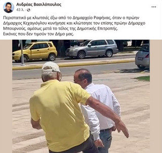 «Περιστατικό με κλωτσιές έξω από το Δημαρχείο Ραφήνας, όταν ο πρώην Δήμαρχος Κεχαγιόγλου κυνήγησε και κλώτσησε τον επίσης πρώην Δήμαρχο Μπουρνούς, αμέσως μετά το τέλος της Δημοτικής Επιτροπής.