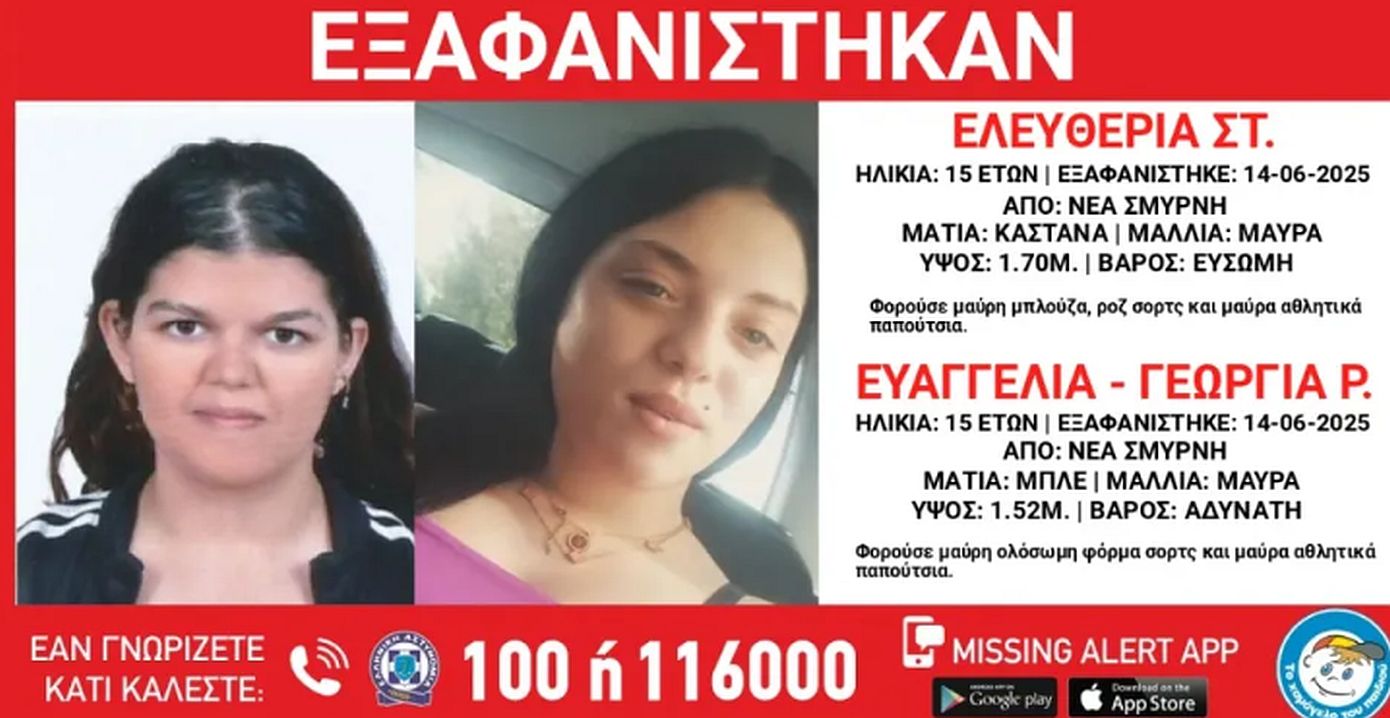Σύμφωνα με την ανακοίνωση του «Χαμόγελου του Παιδιού», το απόγευμα του Σαββάτου (14/6) εξαφανίστηκαν από χώρο φιλοξενίας στην περιοχή της Νέας Σμύρνης, η Ελευθερία Σ., 15 ετών και η Ευαγγελία-Γεωργία Ρ. 15 ετών.