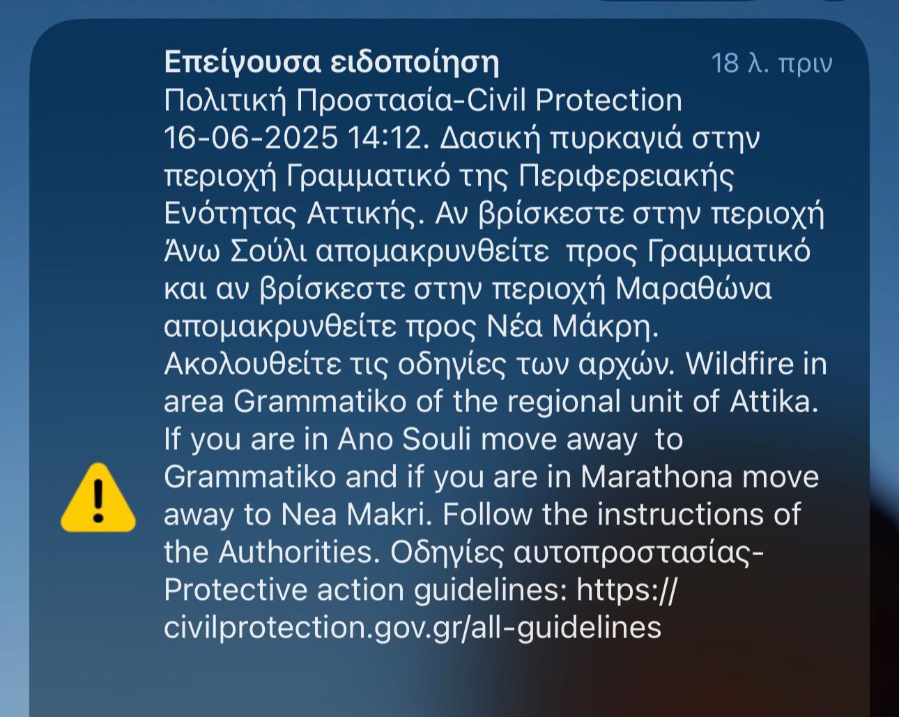 Μηνύματα μέσω του 112 εστάλησαν σε πολίτες που βρίσκονται στο Άνω Σούλι Μαραθώνα και στον Μαραθώνα προκειμένου να απομακρυνθούν προς Γραμματικό και Νέα Μάκρη αντίστοιχα.