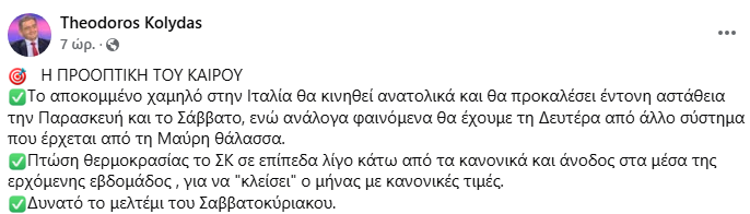 Σύμφωνα με τις προβλέψεις του Θοδωρή Κολυδά, το Σαββατοκύριακο θα χαρακτηριστεί από πτώση της θερμοκρασίας, η οποία θα κυμανθεί σε επίπεδα ελαφρώς κάτω από τα κανονικά για την εποχή.