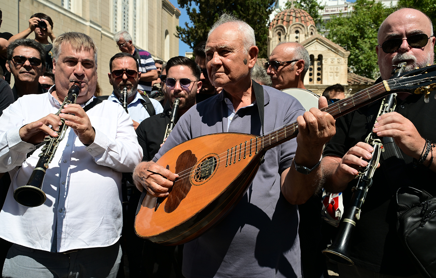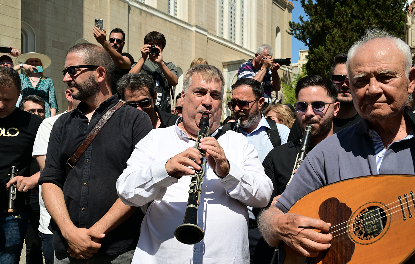 Με παραδοσιακούς ήχους «ντυμένους» με το αγαπημένο του κλαρίνο είπαν το τελευταίο «αντίο» στον Πετρολούκα Χαλκιά συνάδελφοί του που ανέμεναν τη σορό του έξω από τη Μητρόπολη Αθηνών, όπου και εκτέθηκε σε λαϊκό προσκύνημα.