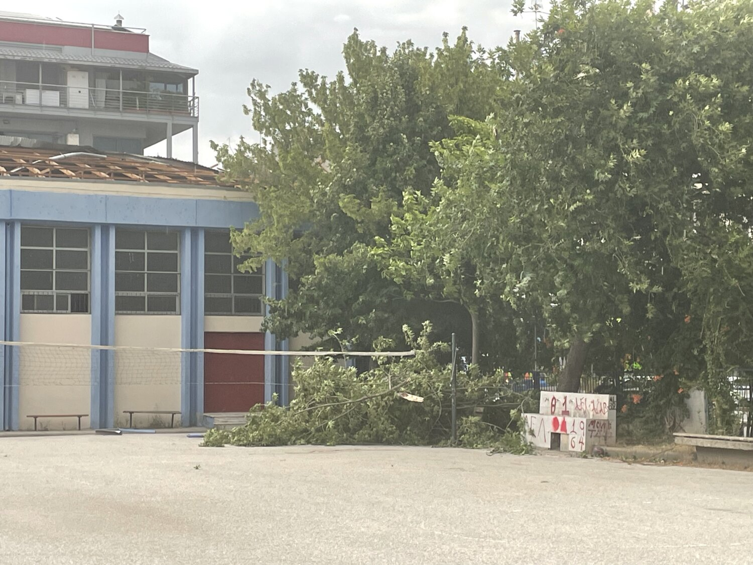 Παράλληλα «θύμα» του δυνατού αέρα έπεσε και η στέγη του γυμναστηρίου του 5ου Γυμνασίου που την «ξήλωσε» ο αέρας, και μάλιστα έχει διακοπεί από την αστυνομία η κίνηση επί της Κομνηνών, ενώ στο προαύλιο του σχολείου έπεσε ένα δέντρο.