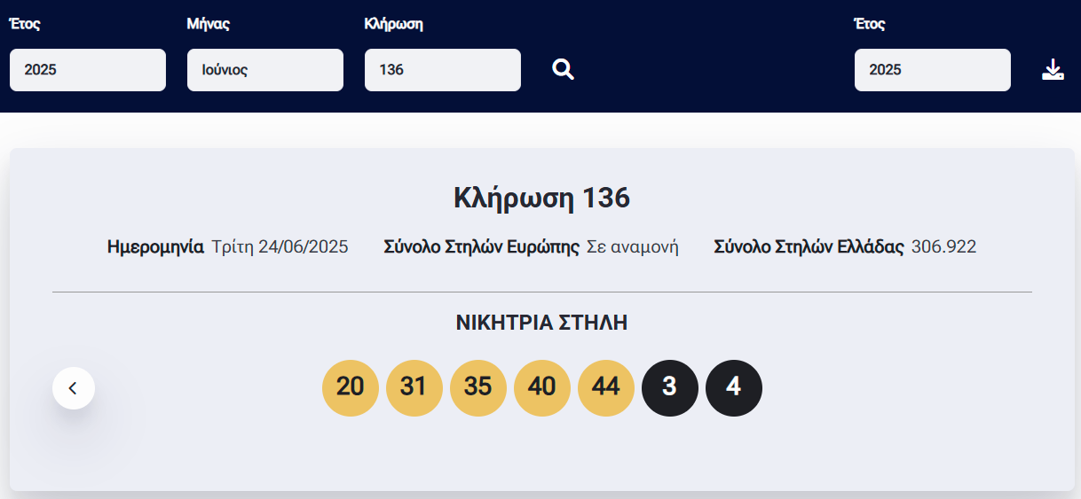 Οι τυχεροί αριθμοί είναι οι εξής: 20, 31, 35, 40, 44 και 3, 4.