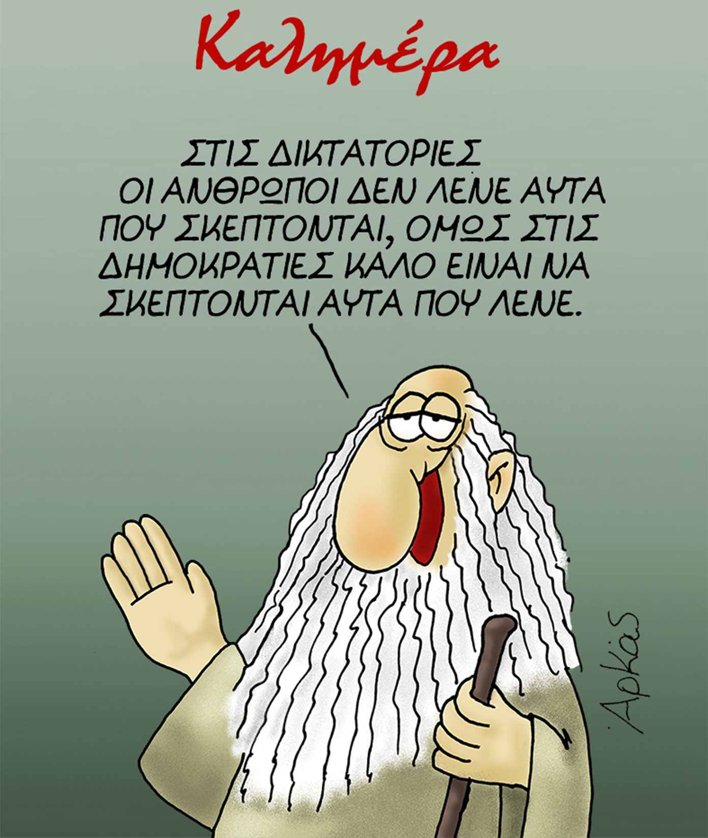 «Καλημέρα» μας λέει ο Αρκάς σήμερα, Τετάρτη 25 Ιουνίου 2025, για μια ακόμα φορά με το χαρακτηριστικό «καυστικό» του ύφος. Πρωταγωνιστικό ρόλο στο σημερινό του σκίτσο παίζει ο γέρος σοφός που σχολιάζει την ελευθερία του λόγου και της έκφρασης στις σύγχρονες δημοκρατίες.