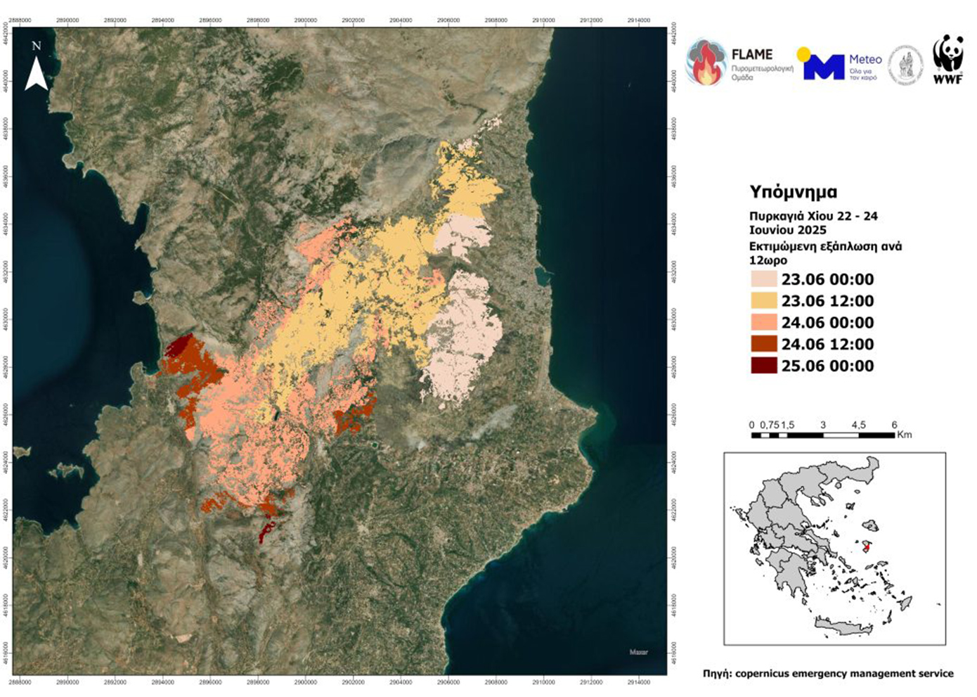 Τις πρώτες 12 ώρες μετά την έναρξη της πυρκαγιάς (Κυριακή 22.06.2025, από ώρα 12:00 έως 23:59), η φωτιά κινήθηκε με εκτιμώμενη μέση ταχύτητα 0,80 χλμ/ώρα, κατακαίγοντας σχεδόν 8.000 στρέμματα.