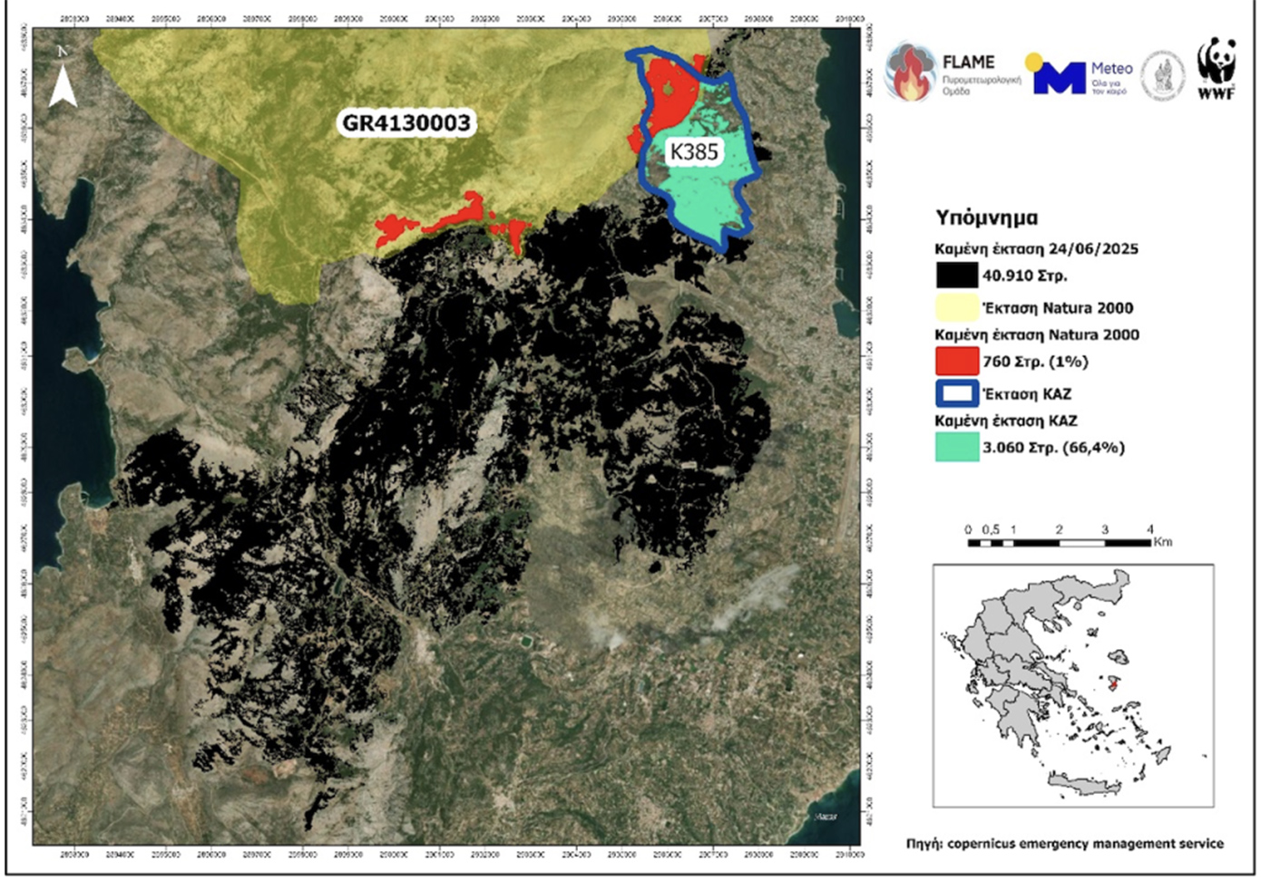Ιδιαίτερη ανησυχία προκαλεί το γεγονός ότι η φετινή πυρκαγιά επηρέασε περίπου 3.800 στρέμματα εντός δύο προστατευόμενων περιοχών, γεγονός που υπογραμμίζει τη σοβαρότητα της περιβαλλοντικής ζημιάς.