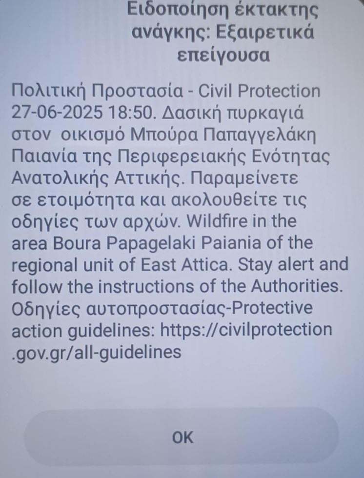 Μήνυμα από το 112 στάλθηκε στους κατοίκους της περιοχής, λέγοντάς τους να παραμείνουν σε ετοιμότητα και να ακολουθούν τις οδηγίες των αρχών.
