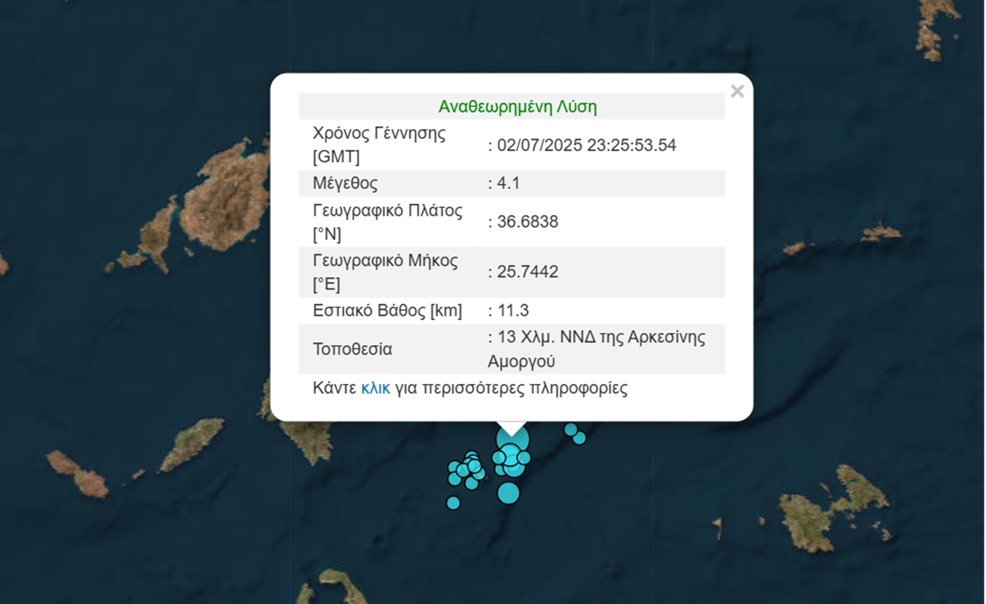 Σεισμός μέγεθος 4,1 Ρίχτερ καταγράφηκε στις 02:25 τα ξημερώματα της Πέμπτης στη θαλάσσια περιοχή κοντά στην Αμοργό.