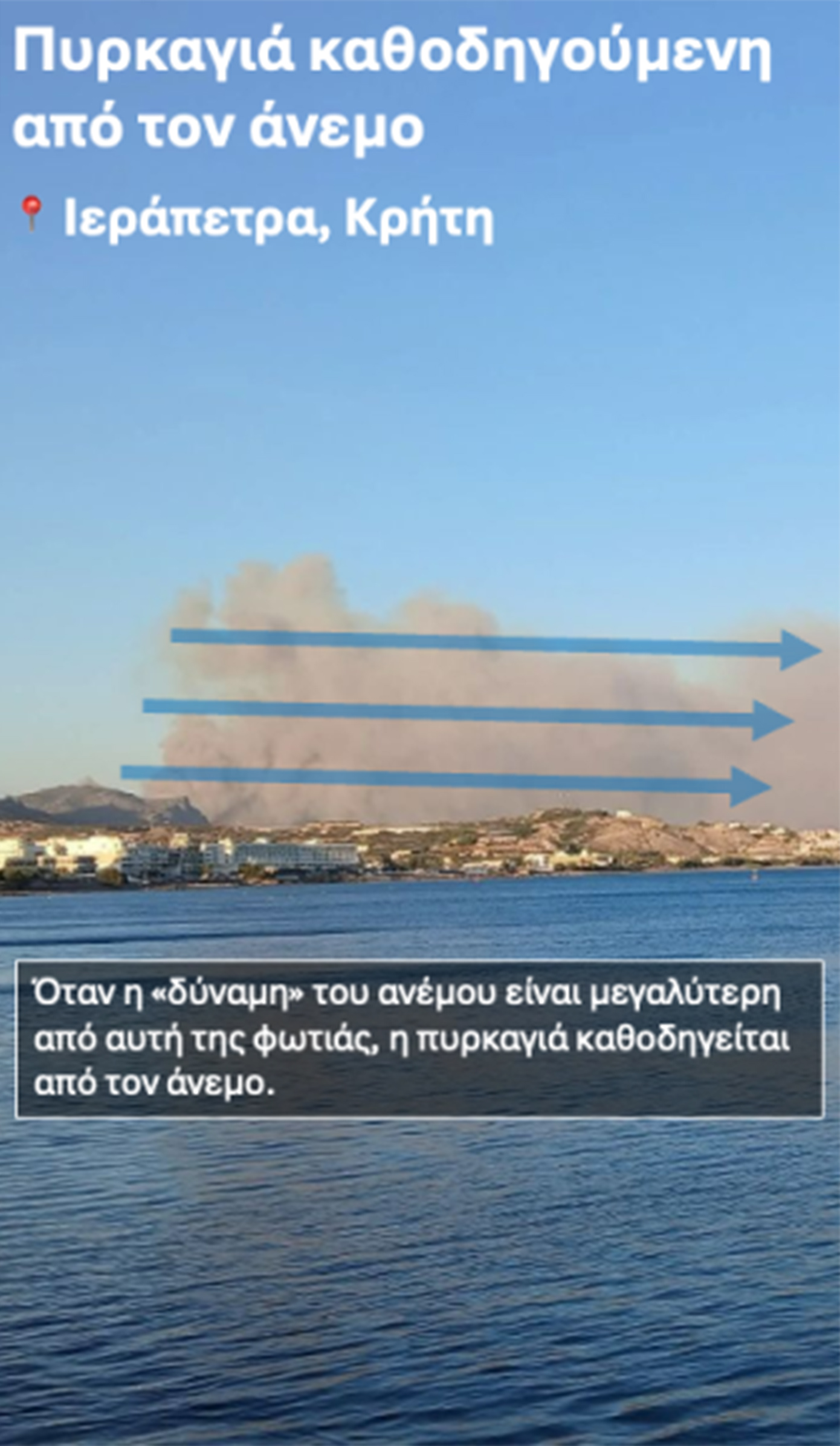 Την ίδια στιγμή στην Ιεράπετρα (Λασίθι, Κρήτη) οι συνθήκες ήταν τελείως διαφορετικές. Η πυρκαγιά εκδηλώθηκε σε περιοχή με χαμηλή βλάστηση και ενώ έπνεαν θυελλώδεις βόρειοι άνεμοι. Η ένταση του ανέμου ήταν τέτοια που ξεπερνούσε τη «δύναμη» της θερμότητας που εκλυόταν από την καύση, με αποτέλεσμα η φωτιά να καθοδηγείται απόλυτα από τον άνεμο, με τον καπνό να εκτείνεται σχεδόν παράλληλα με το έδαφος. Οι πυρκαγιές που παρουσιάζουν αυτή την «εικόνα» χαρακτηρίζονται ως καθοδηγούμενες από τον άνεμο. Αν και η εξάπλωσή τους είναι περισσότερο προβλέψιμη, μπορούν να κινούνται εξαιρετικά γρήγορα, καλύπτοντας μεγάλες αποστάσεις σε μικρούς χρόνους.