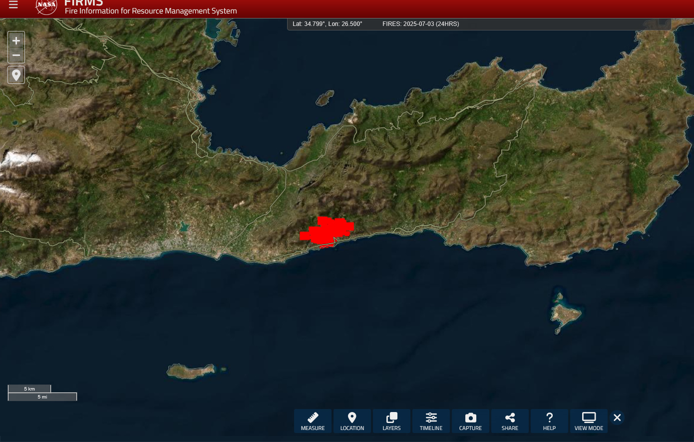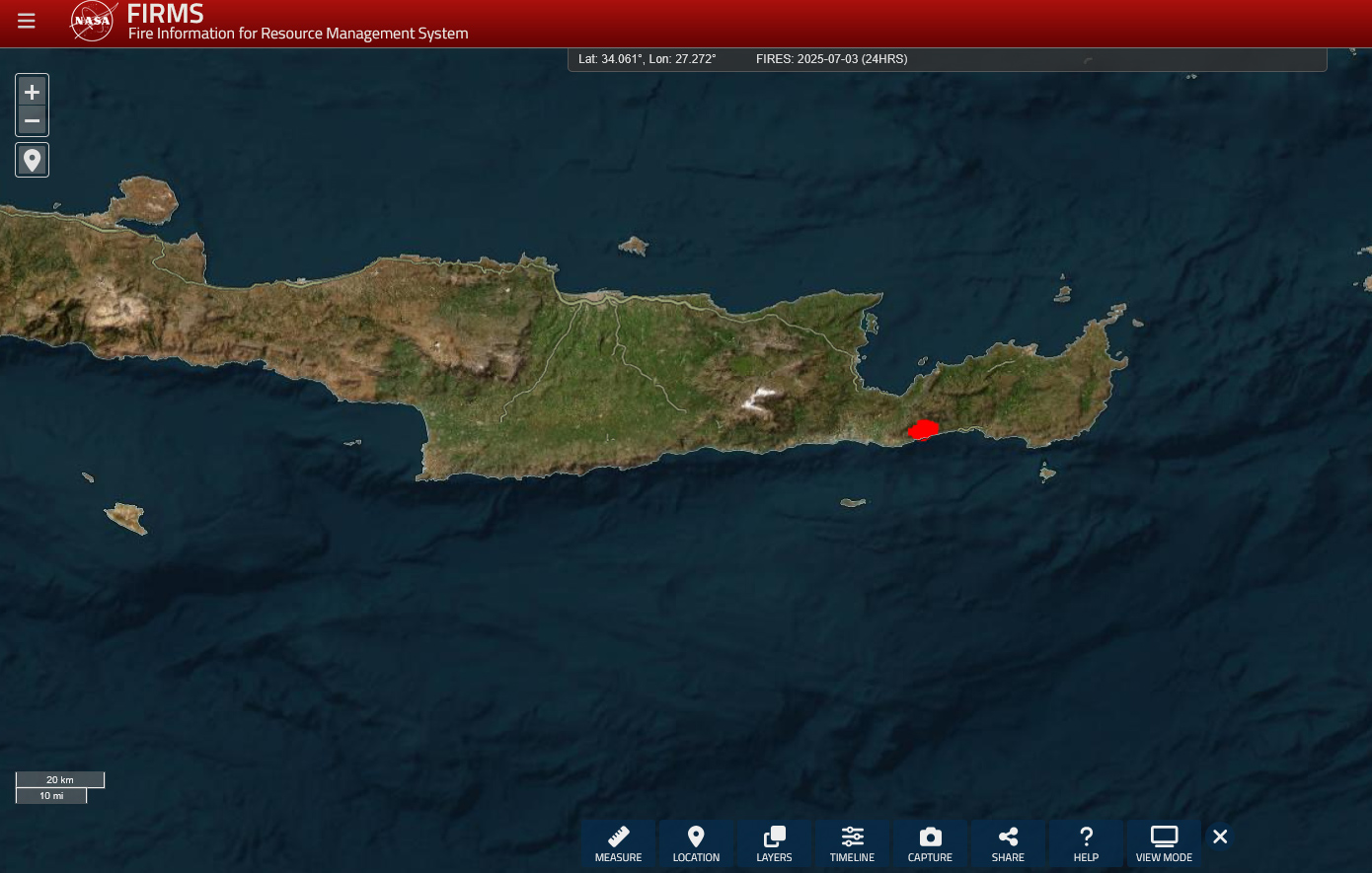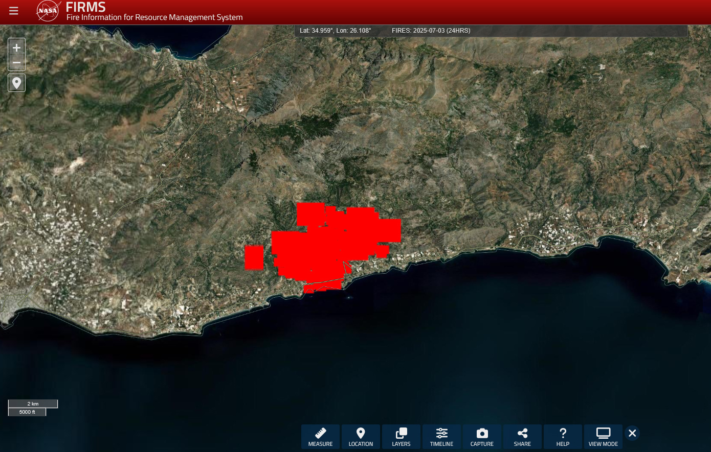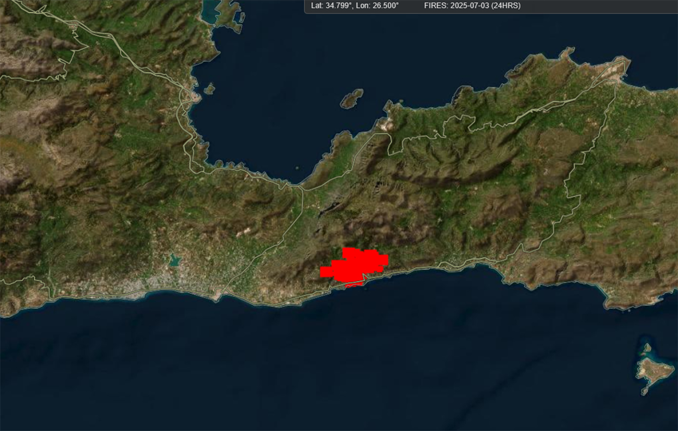 Στη δορυφορική απεικόνιση που καταγράφεται από τα συστήματα παρακολούθησης του προγράμματος FIRMS της NASA, καταγράφεται η έκταση της καταστροφής από τη μεγάλη φωτιά που καίει στην ανατολική Ιεράπετρα από το απόγευμα της Τετάρτης.
