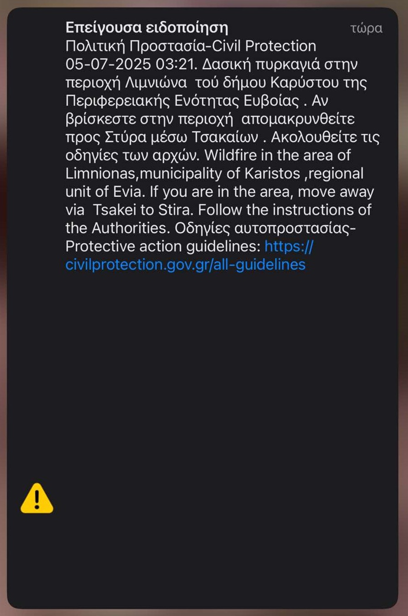 Ήχησε το 112 τα ξημερώματα του Σαββάτου ζητώντας από τους πολίτες που βρίσκονται στην περιοχή Λιμνιώνα να απομακρυνθούν προς Στύρα μέσω Τσακαίων.
