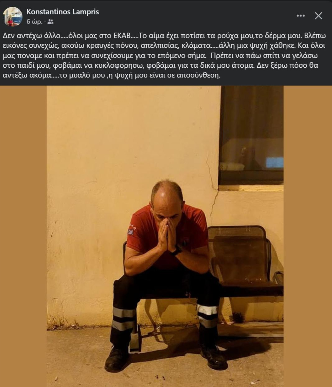 «Δεν αντέχω άλλο… όλοι μας στο ΕΚΑΒ… το αίμα έχει ποτίσει τα ρούχα μου, το δέρμα μου. Βλέπω εικόνες συνεχώς, ακούω κραυγές πόνου, απελπισίας, κλάματα… άλλη μια ψυχή χάθηκε. Και όλοι μας πονάμε και πρέπει να συνεχίσουμε για το επόμενο σήμα. Πρέπει να πάω σπίτι να γελάσω στο παιδί μου, φοβάμαι να κυκλοφορήσω, φοβάμαι για τα δικά μου άτομα. Δεν ξέρω πόσο θα αντέξω ακόμα… το μυαλό μου, η ψυχή μου είναι σε αποσύνθεση», γράφει ο κ. Λάμπρης.