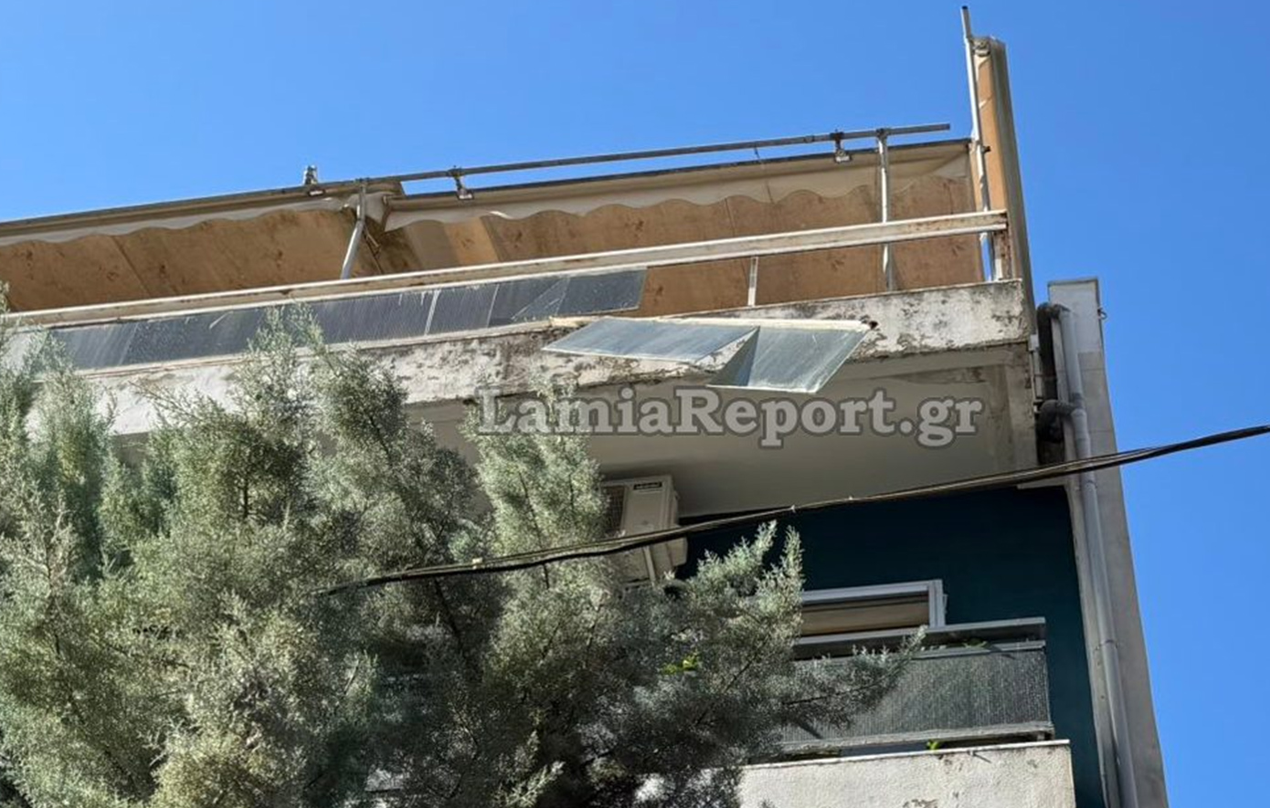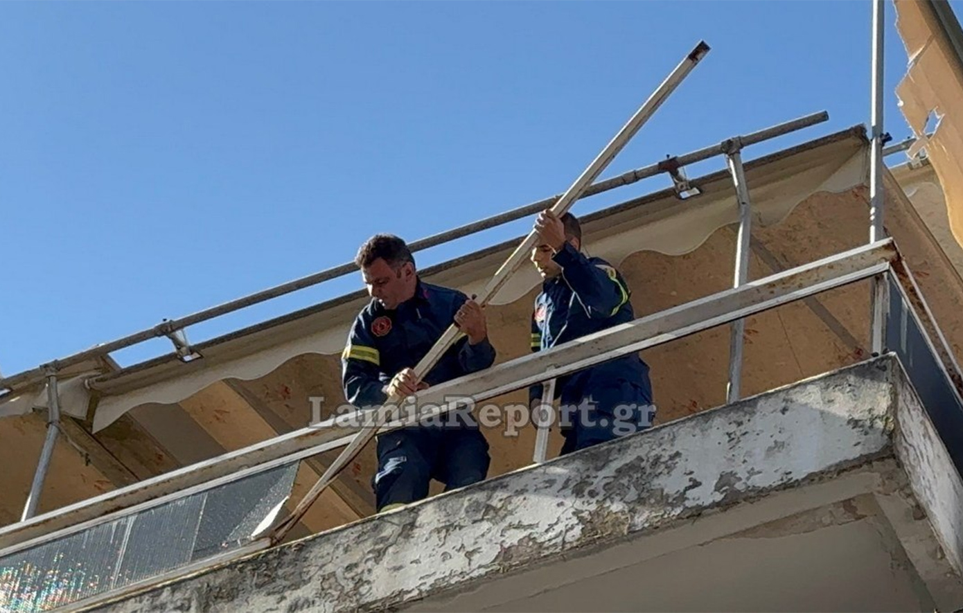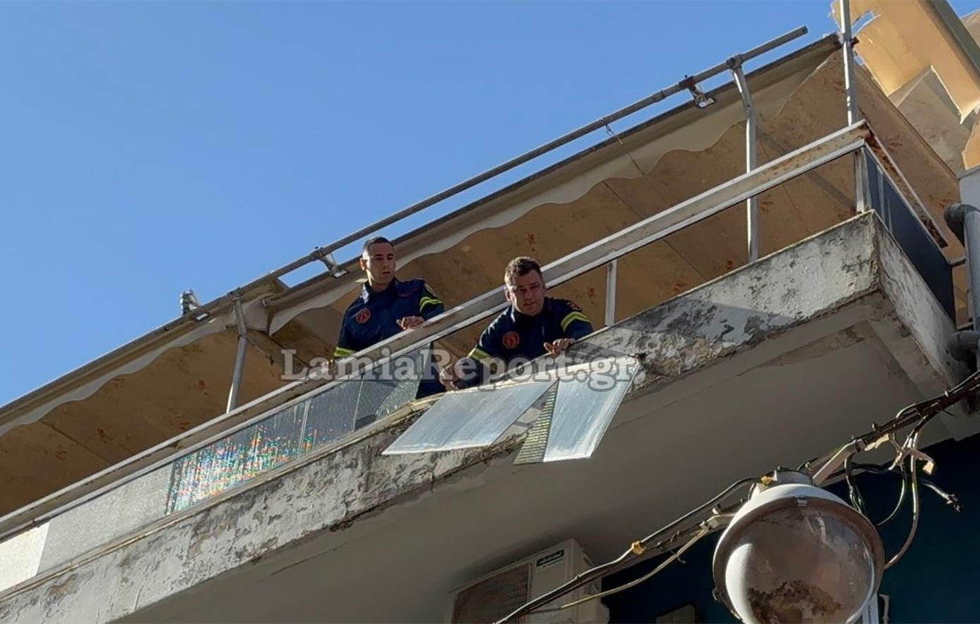 Ένα τεράστιο κομμάτι κάγκελου με τζάμια ξήλωσαν κατά το ήμισυ σήμερα το πρωί οι ισχυρές ριπές ανέμων στην οδό Ροζάκη Αγγελή στη Λαμία, με αποτέλεσμα να κρέμεται πάνω από τα κεφάλια δεκάδων ανύποπτων περαστικών.