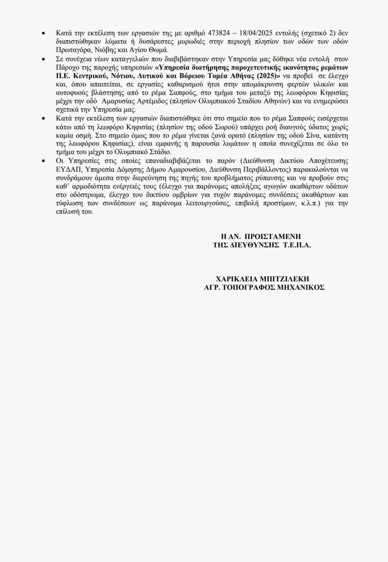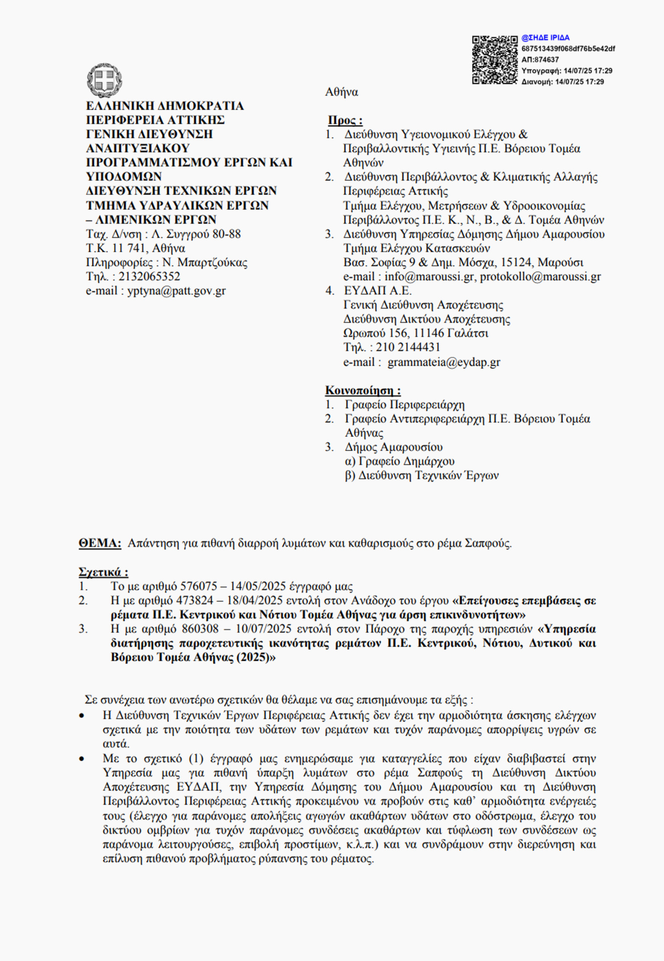 Το έγγραφο της Περιφέρειας αναφέρει συγκεκριμένα, πως στο σημείο που το ρέμα Σαπφούς βρίσκεται κάτω από τη λεωφόρο, υπάρχει ροή άοσμου διαυγούς ύδατος. Εκεί που το ρέμα γίνεται και πάλι ορατό, κοντά στην οδό Σίνα, είναι εμφανής η παρουσία λυμάτων που συνεχίζεται μέχρι και το ΟΑΚΑ.