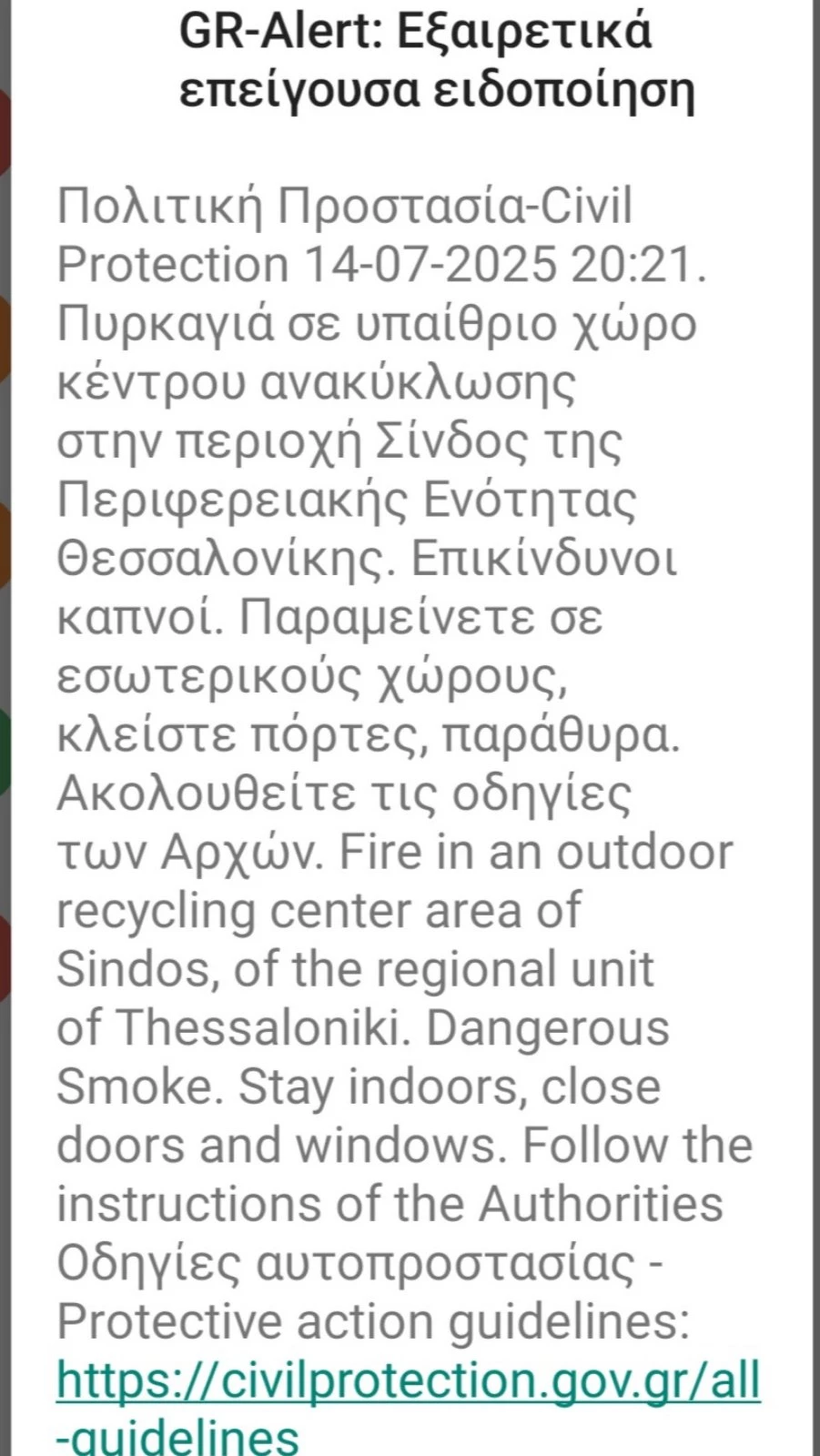 Για τη φωτιά μάλιστα στάλθηκε μήνυμα του 112 με τα τηλέφωνα όσων βρίσκονται κοντά στην περιοχή να χτυπούν με ενημέρωση να μείνουν σε εσωτερικούς χώρους, κλείνοντας πόρτες και παράθυρα.