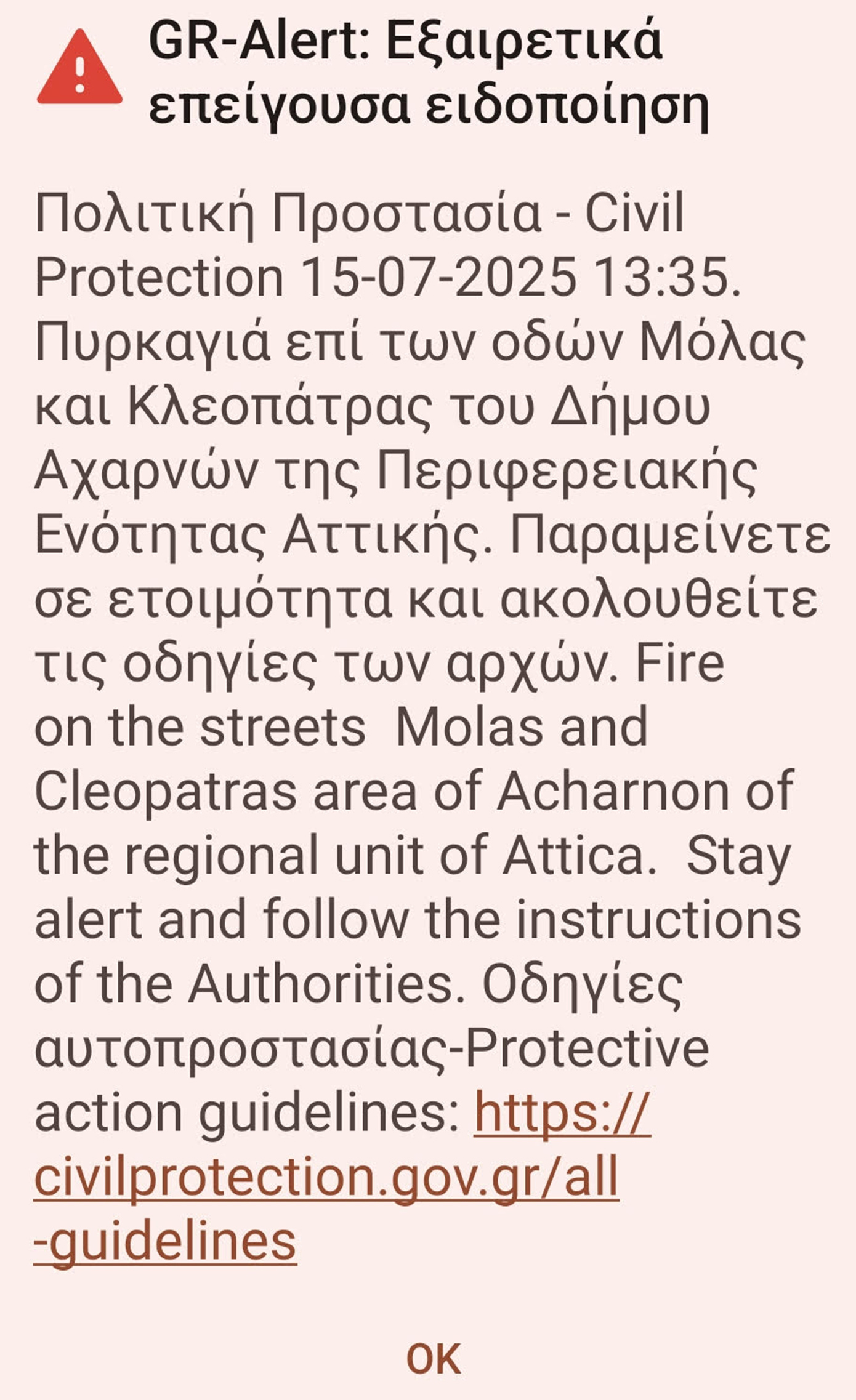 Το μήνυμα αναφέρει: «Πυρκαγιά επί των οδών Μόλας και Κλεοπάτρας του δήμου Αχαρνών της Περιφερειακής Ενότητας Αττικής. Παραμείνετε σε ετοιμότητα και ακολουθείτε τις οδηγίες των Αρχών».
