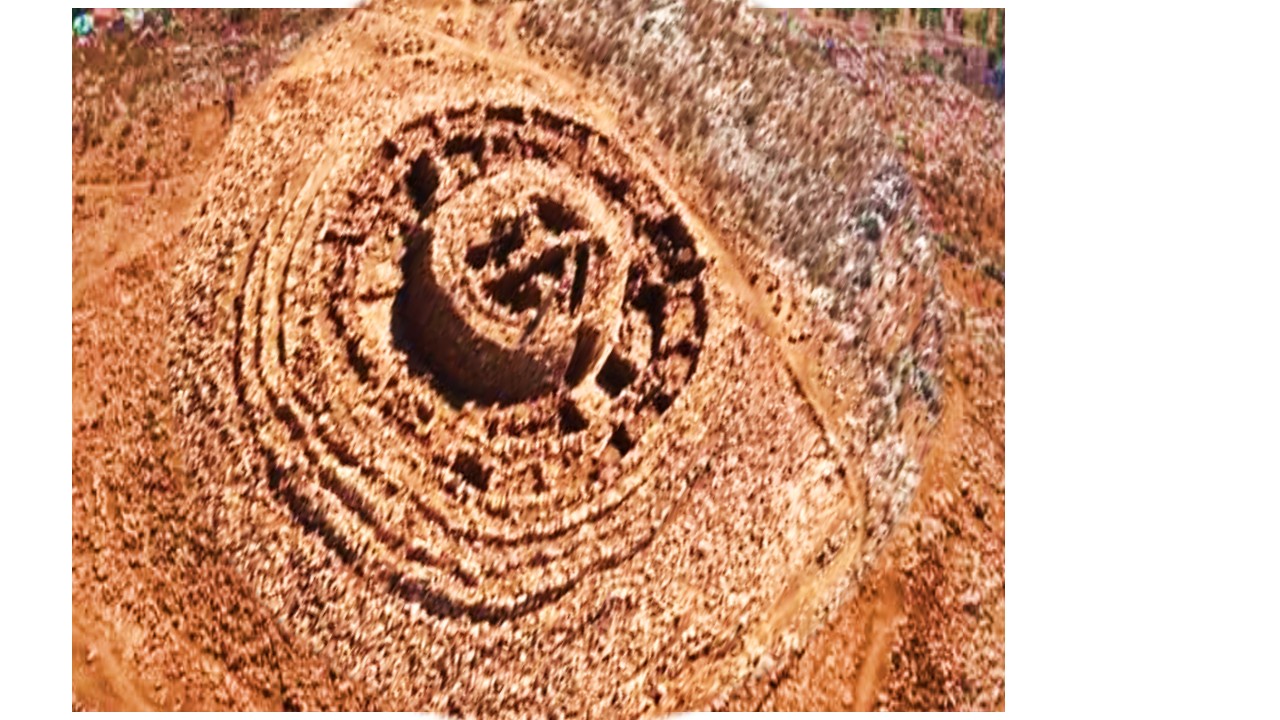 - Στην κορυφή του ανακαλύφθηκε τεράστιος βαθμιδωτός κυκλικός πύργος με επτά ομόκεντρες κυλινδρικές κατασκευές.